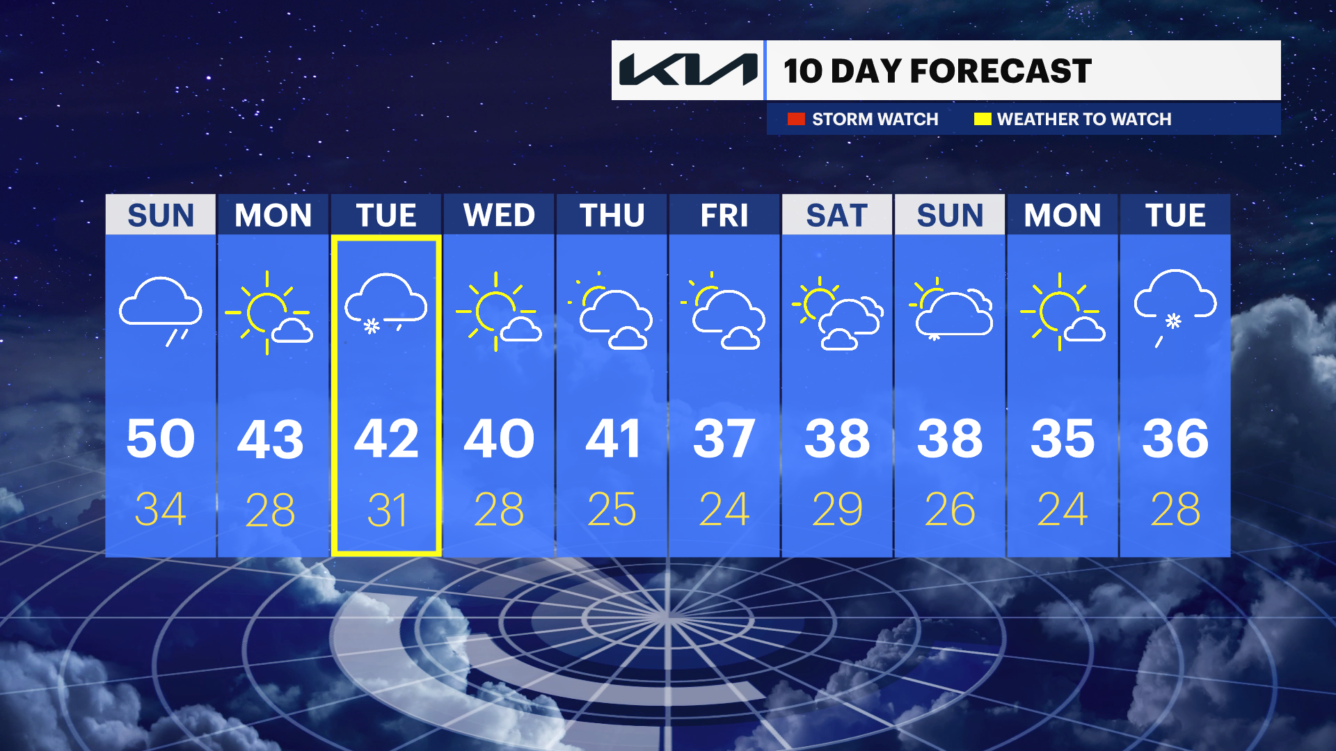 Wednesday: Mostly sunny and chillier; highs near 40.