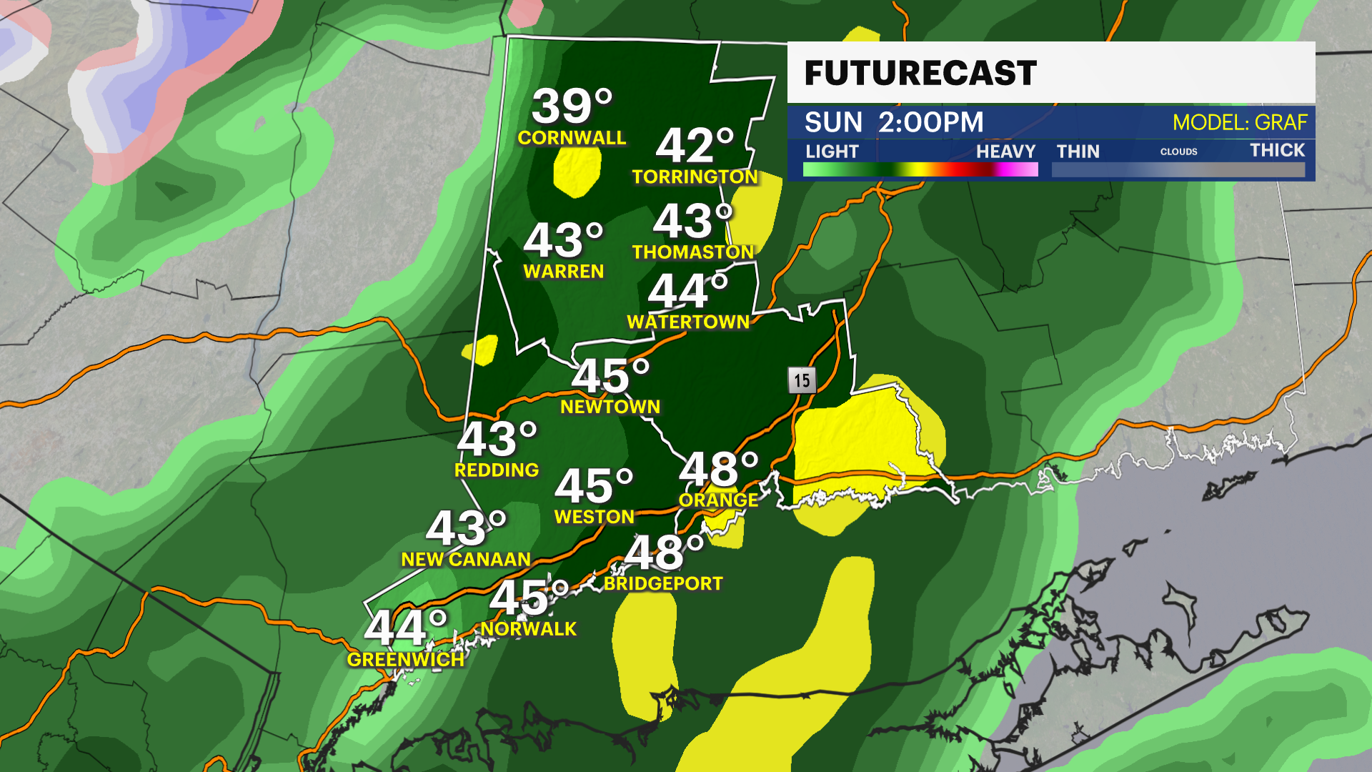 Sunday: Rain develops in the afternoon; highs near 50 with increasing southerly winds.