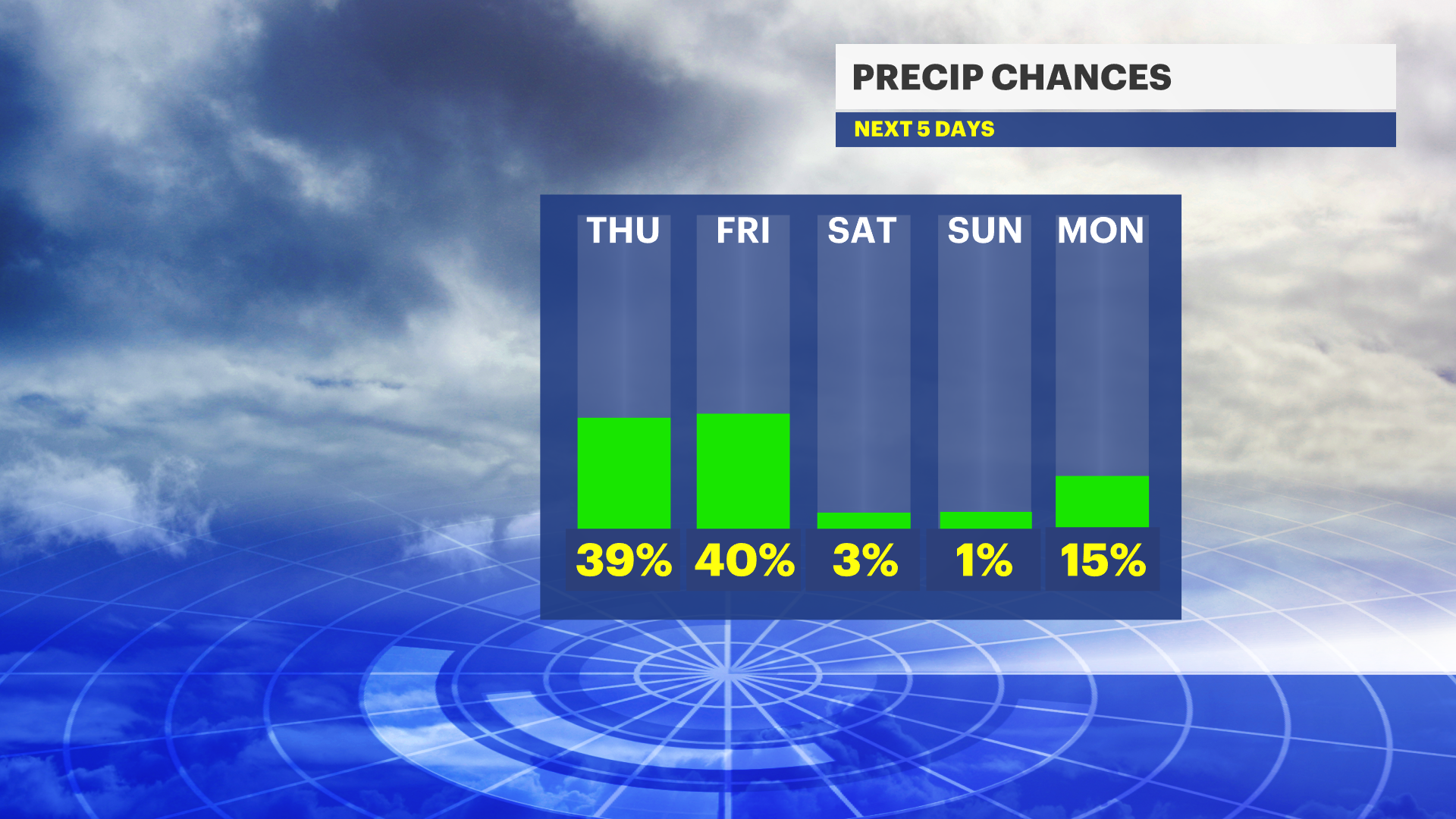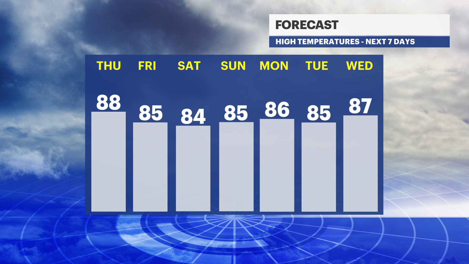 FRIDAY: Mostly sunny and warm, more humid. High of 87.