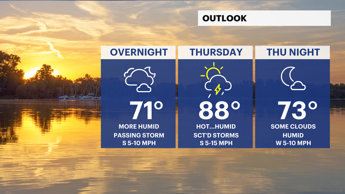 NOW AND NEW: Storm Watch Team Meteorologist Steve Teeling says showers will end overnight and that it will be mostly cloudy. Thursday will be mostly sunny and warmer with highs in the low- to mid-80s.