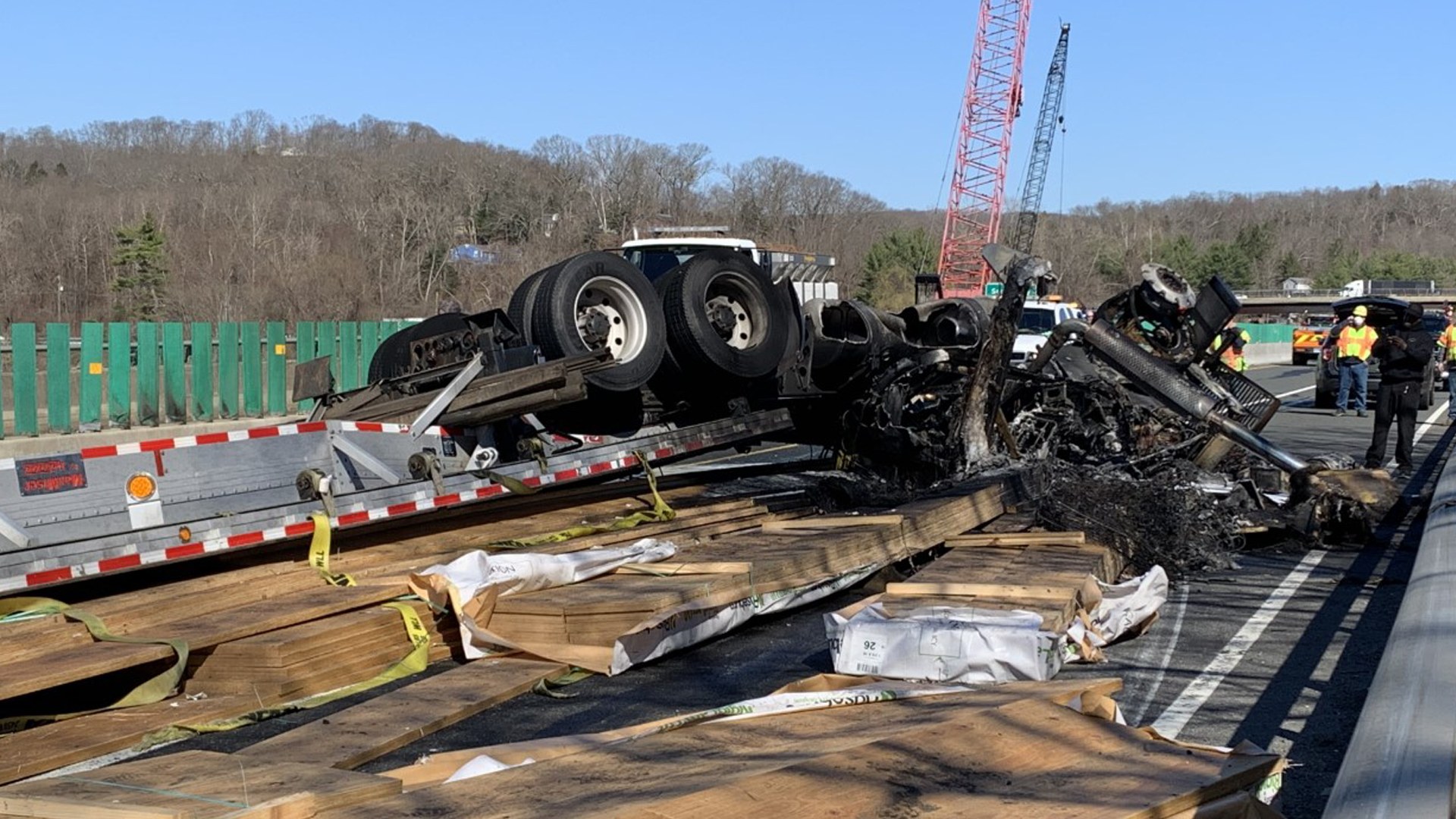 A tractor-trailer crash, fire and fuel spill closed I-84 Tuesday, state police say.