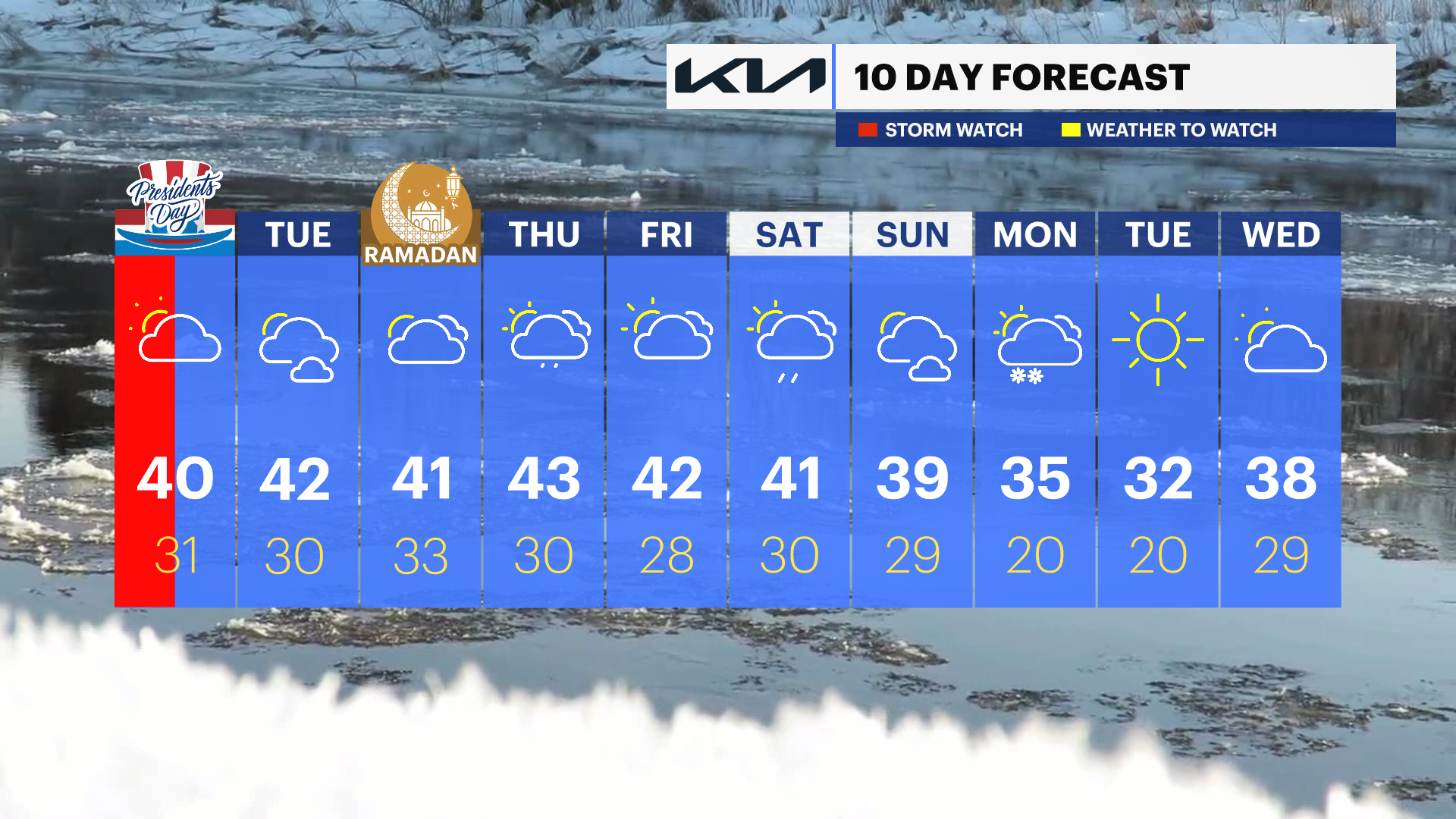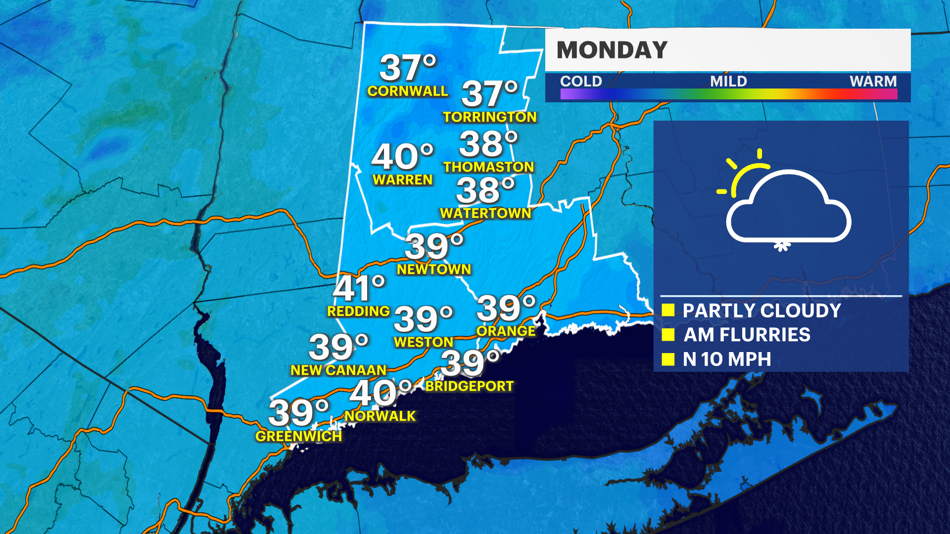 Monday will begin cloudy but should become partly sunny by midday, with temperatures near seasonal levels. Tuesday remains mild as highs return to the 40s.