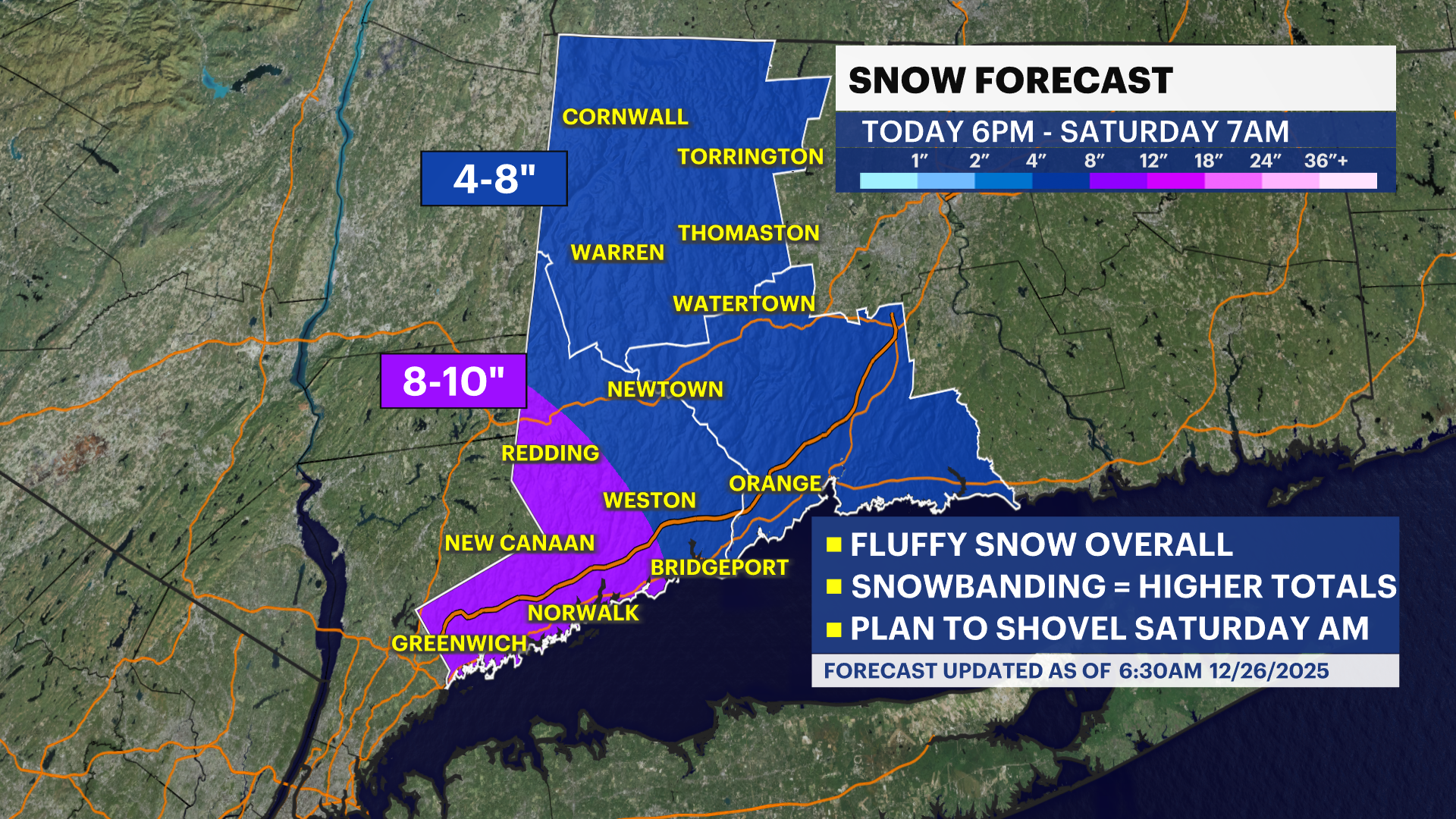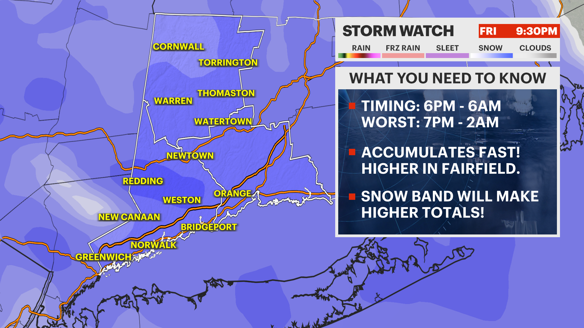 Snowfall totals could be higher in a snow band likely to develop over Fairfield County later in the evening. The worst of the storm is expected between 7 p.m. and 2 a.m.