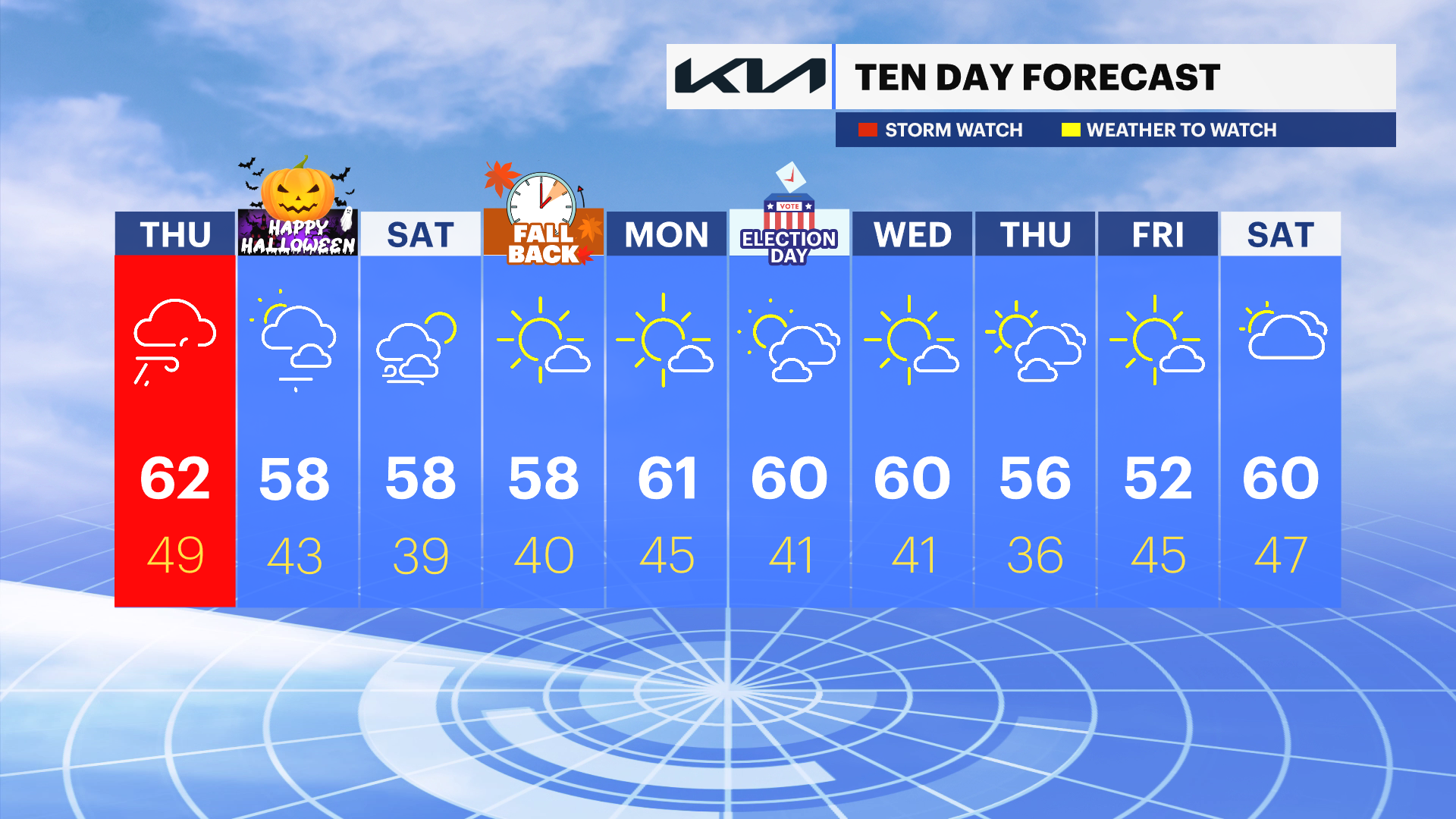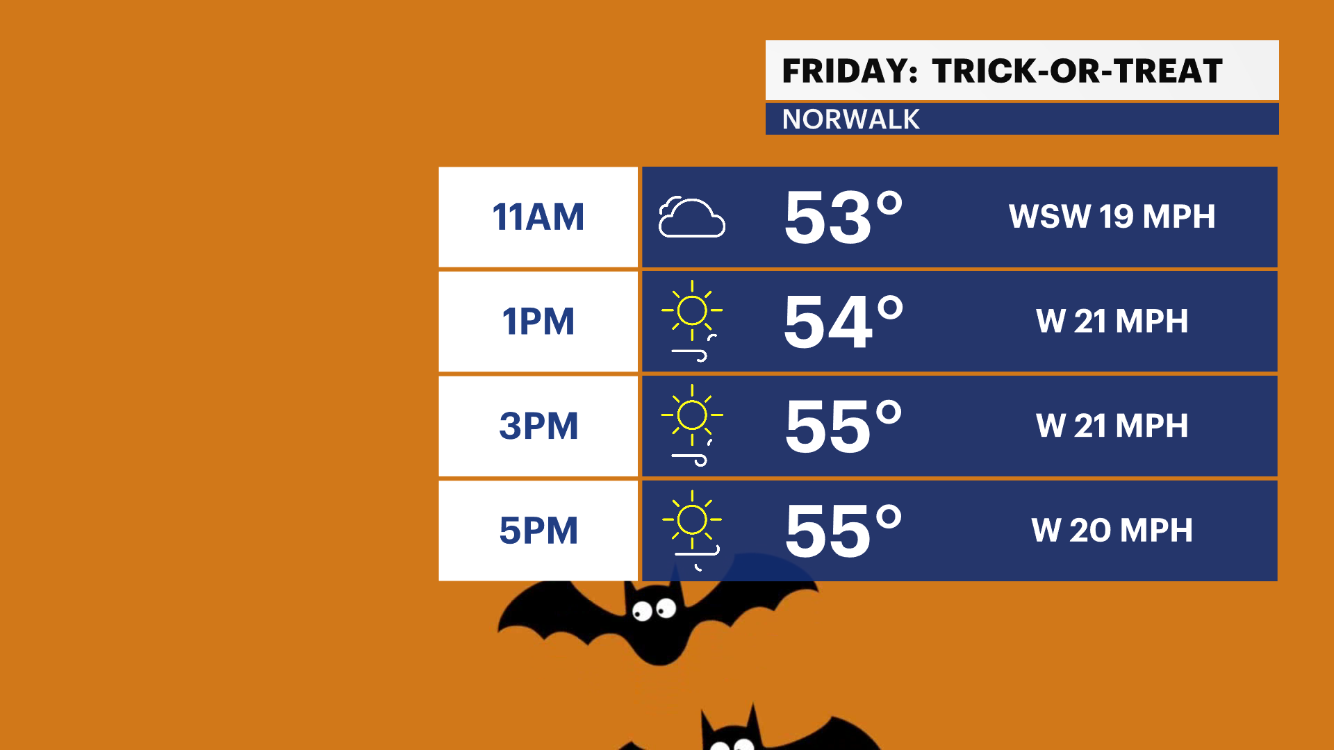 For Friday, let's just say it'll be a hallowing Halloween, or rather a "hollowing" Halloween. Although stray showers will end in time for trick-or-treaters, the wind will pick up. Expect temperatures in the mid-50s with wind gusts 20-30 mph through the afternoon. Temperatures will drop into the 40s after sunset with wind chills in the upper 30s for any late Halloween plans.