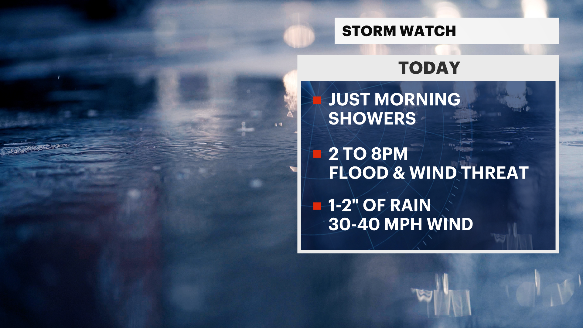 We're tracking a storm that will bring gusty downpours this afternoon. The worst of the rain is expected for the evening commute. There is a risk for minor flooding on a few streets and isolated downed trees from the wind. 1 to 2 inches of rain is expected and winds will gust 30-40 mph.