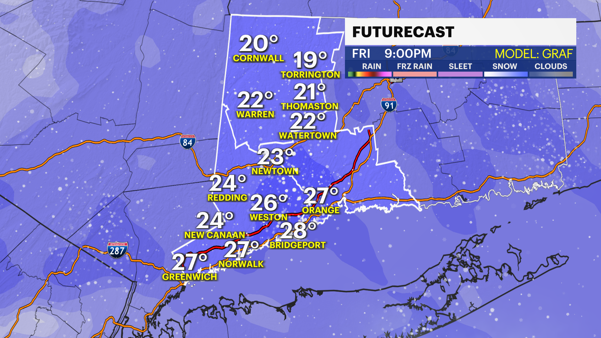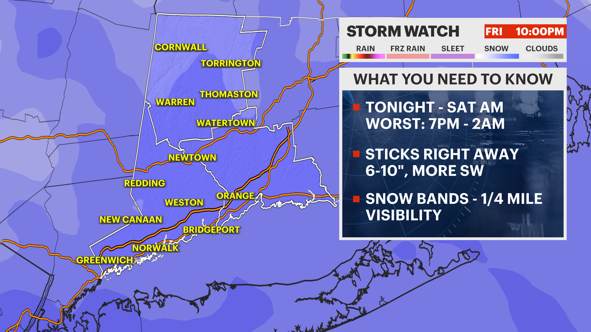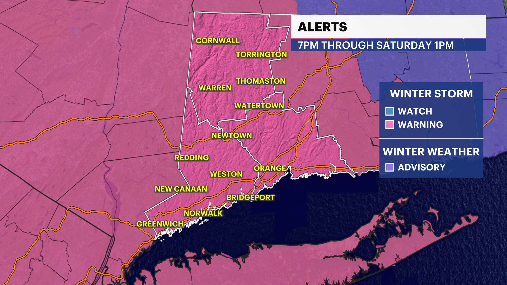 ALERTS: Winter Storm Warning for Fairfield, Litchfield and New Haven counties from 7 p.m. Friday to 1 p.m. Saturday.