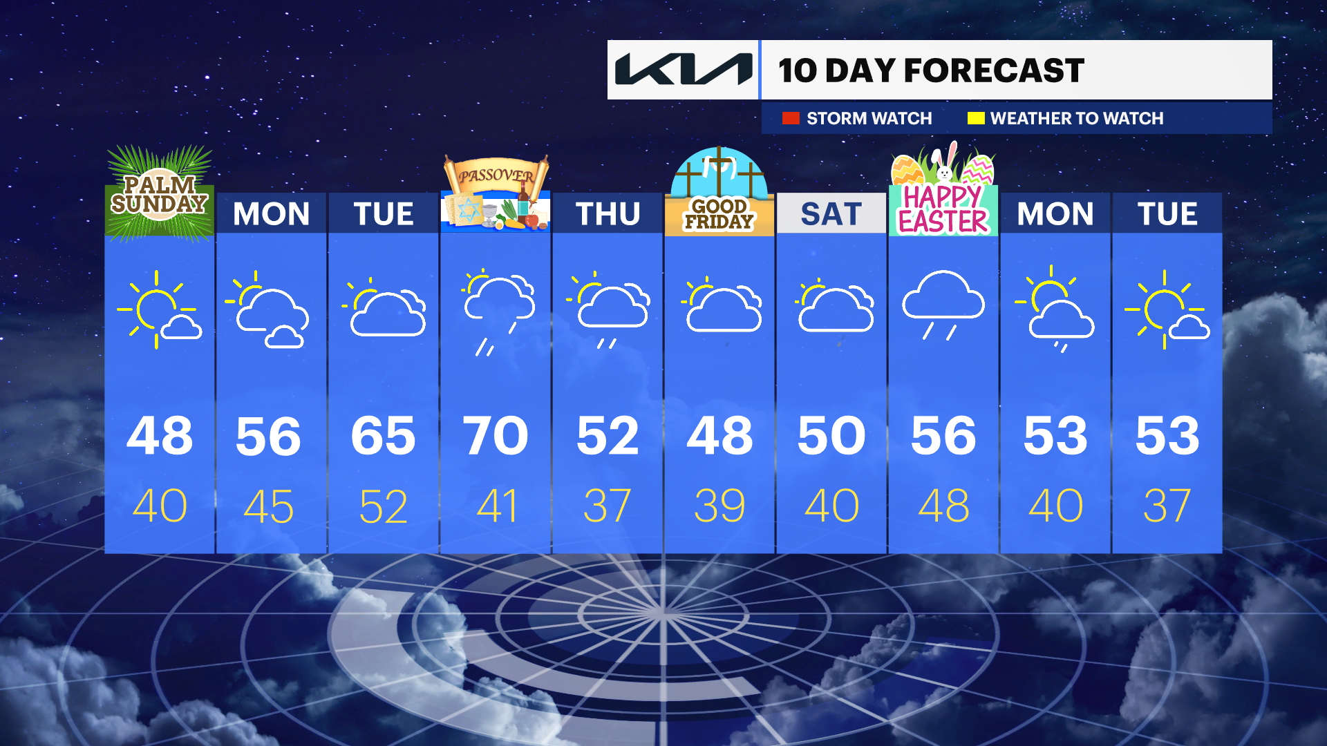 This warmup is a welcome tease of the season ahead. Sunday kicks things into the 50s. There will be a steady climb until temperatures potentially reach the low-70s by Tuesday afternoon. However, that warmth comes with a catch: a side of showers and even a potential thunderstorm. This spring-like swing brings back cooler air after Wednesday. You'll definitely want to grab the umbrella by Monday night.