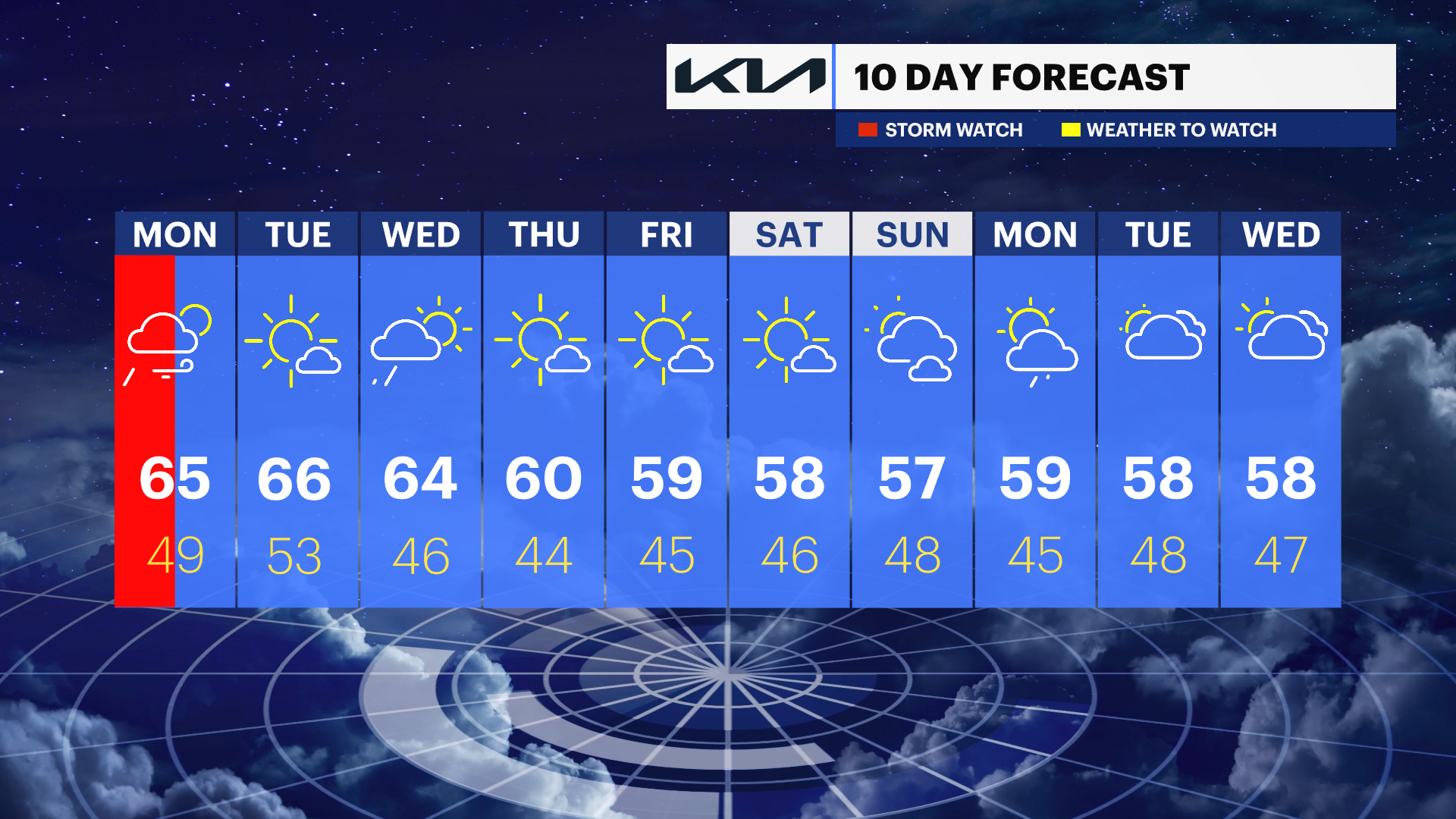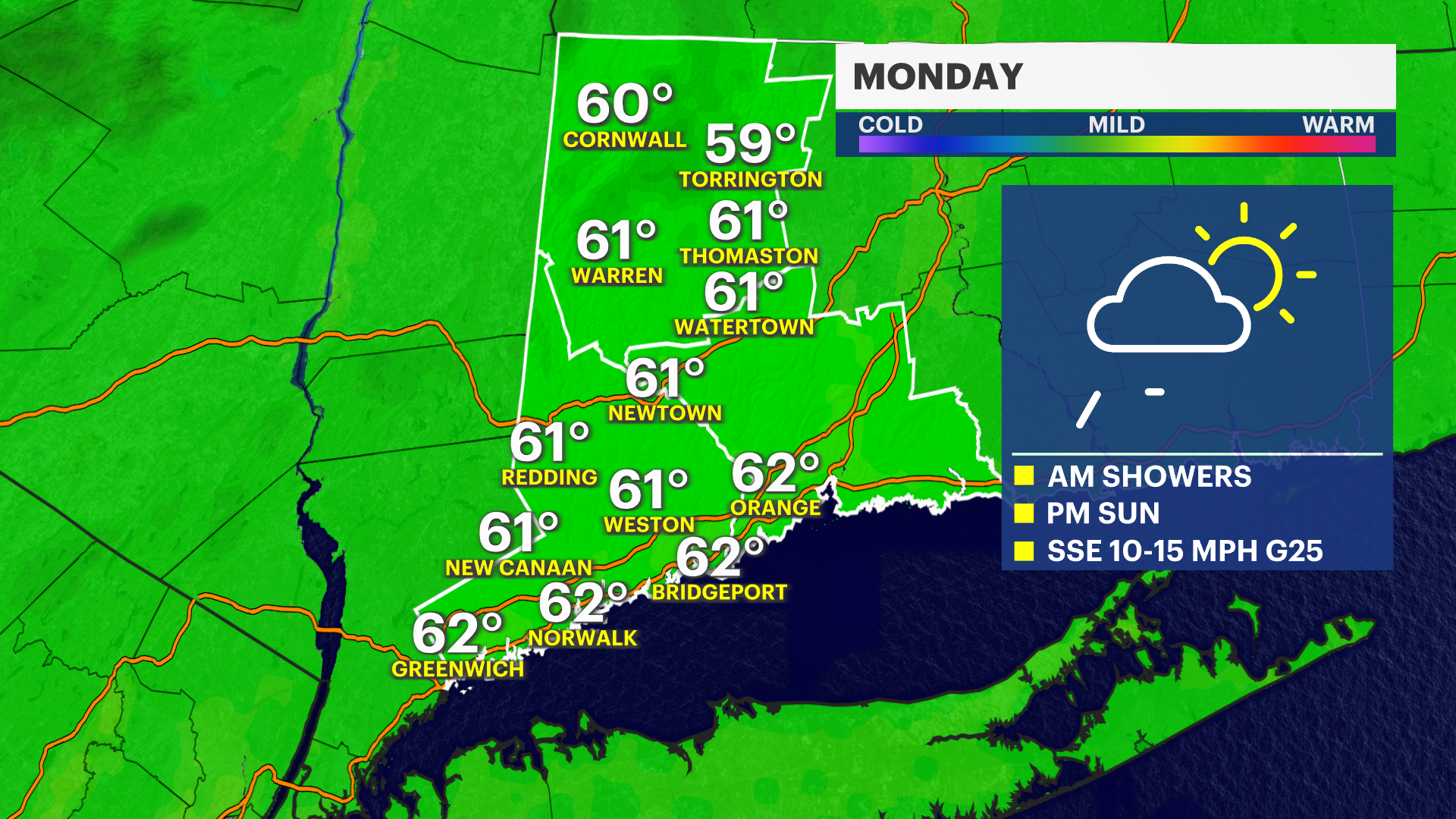 MONDAY: Rain and wind continue. Dries out by pm. Highs in the lower 60s, lows in the low 50s.
