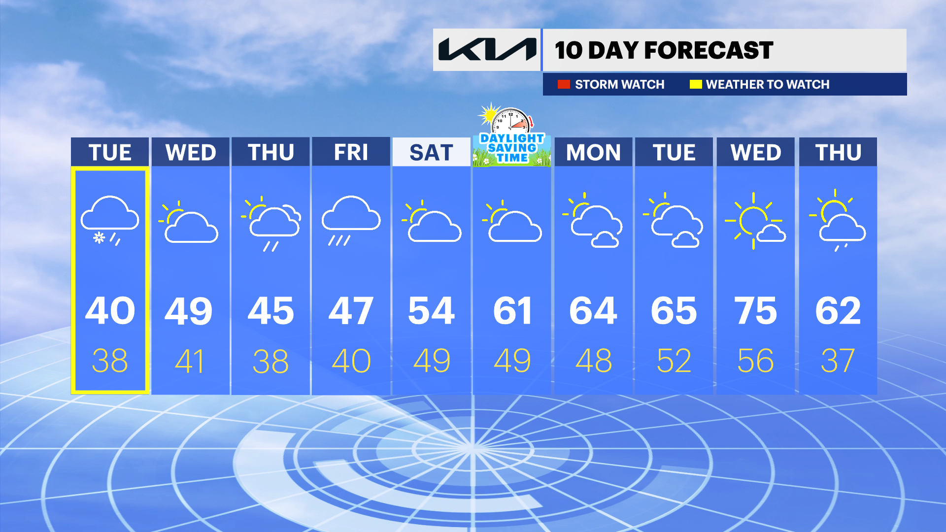 SATURDAY: Mostly cloudy and mild. Temperatures climb from the mid-40s into the mid-50s.