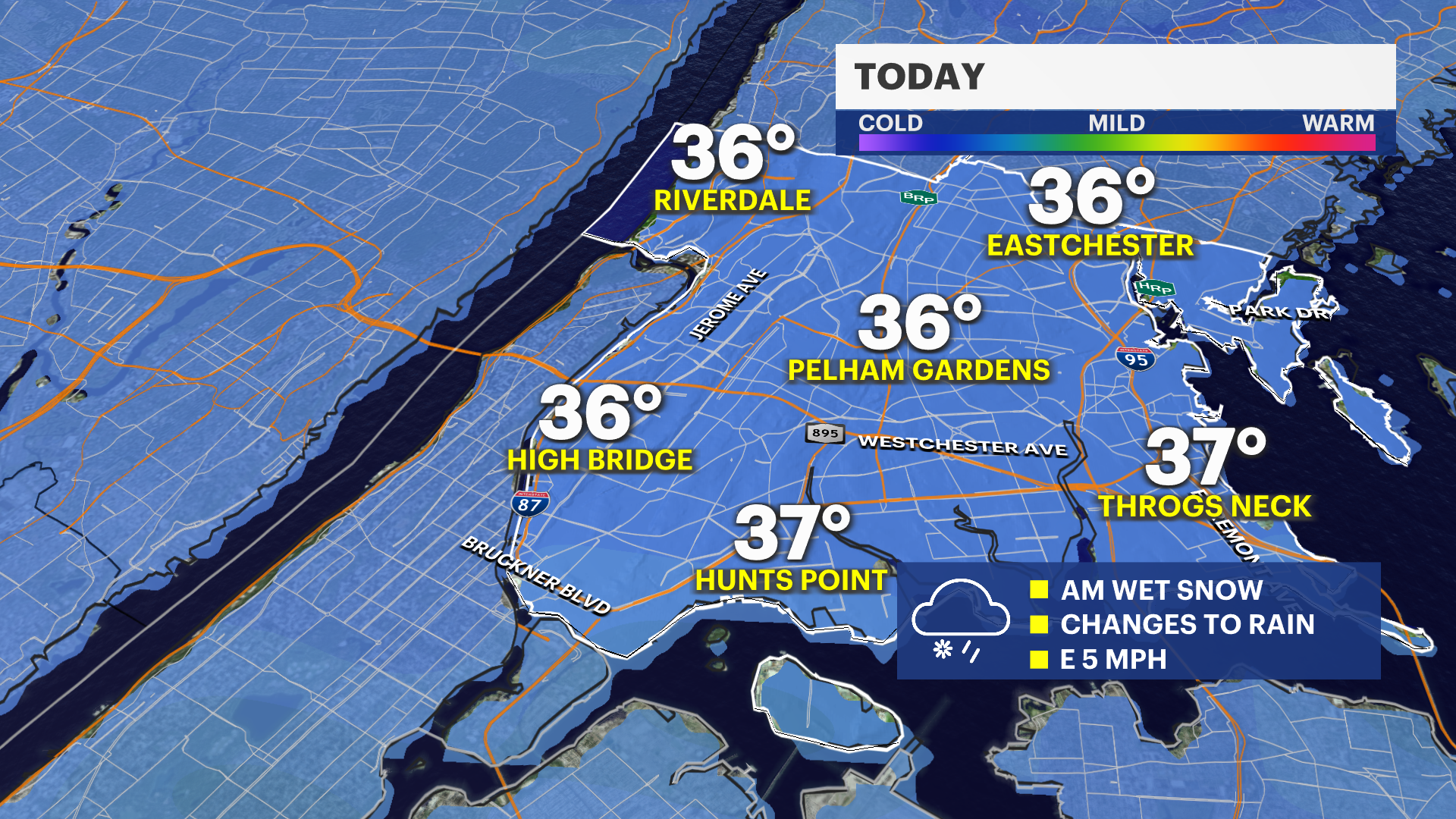 TUESDAY: Snow early, mixing with and changing to rain. Temperatures climb from the low 30s to the low 40s.