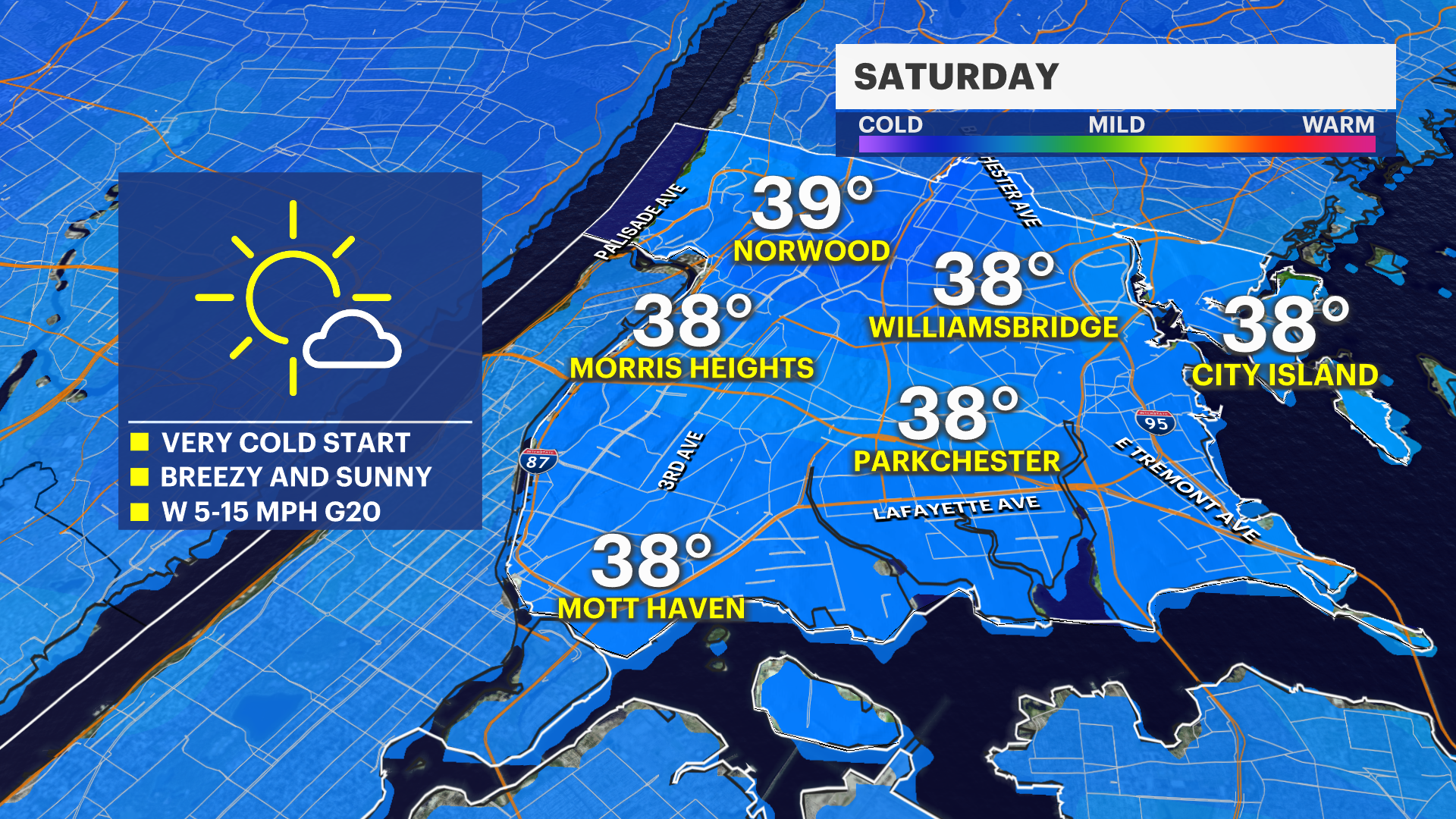 SATURDAY: Highs in the high 30s, lows in the mid-30s. Sunny and bright, breezy.