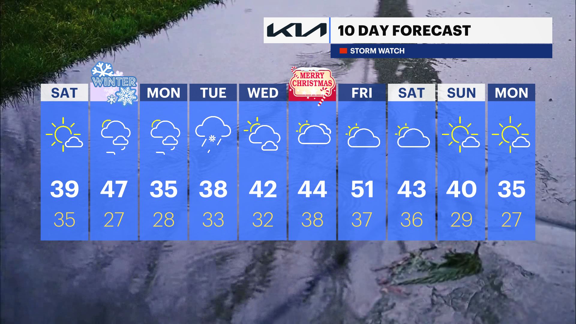 THURSDAY: Christmas! Highs in the mid-40s, lows in the low 30s. Low rain/snow chances.