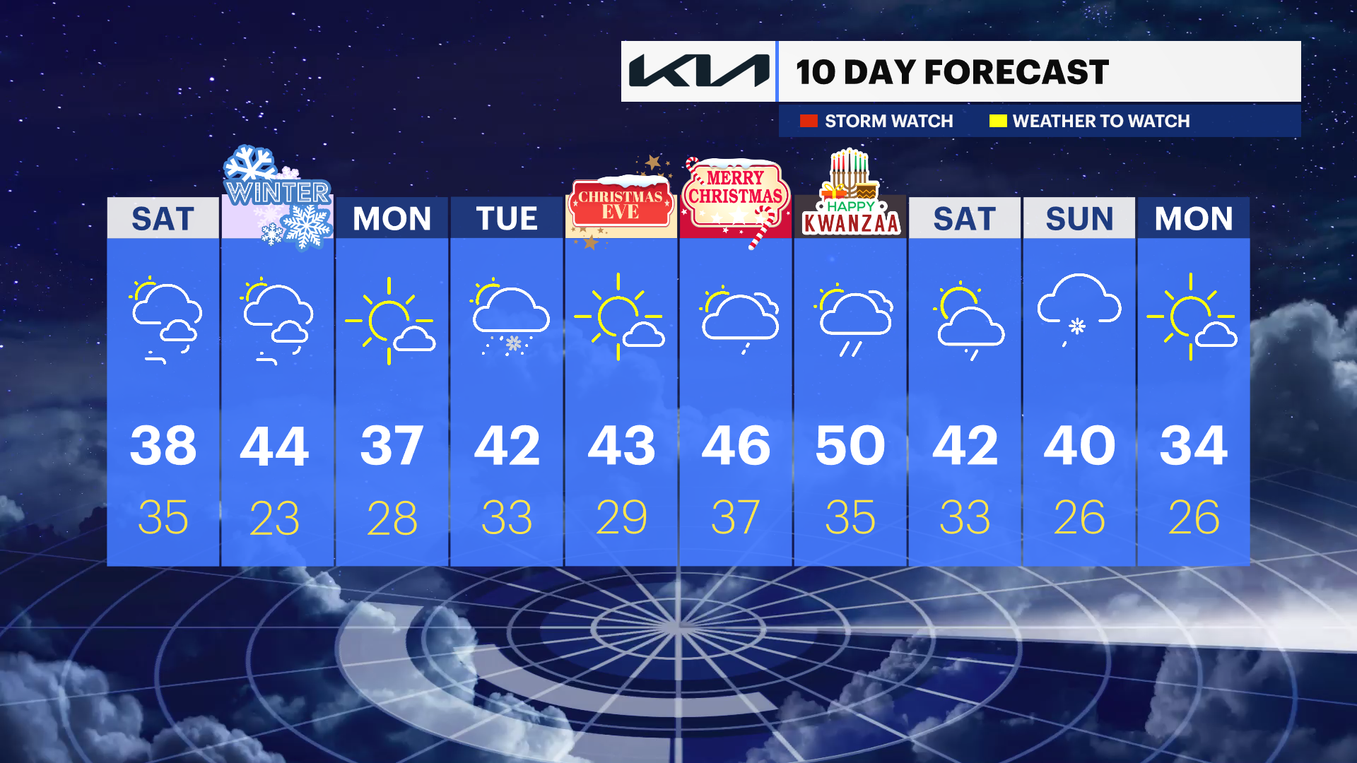Temperatures on Christmas Eve and Christmas Day will be milder in the high-40s to 50s with a chance of rain.