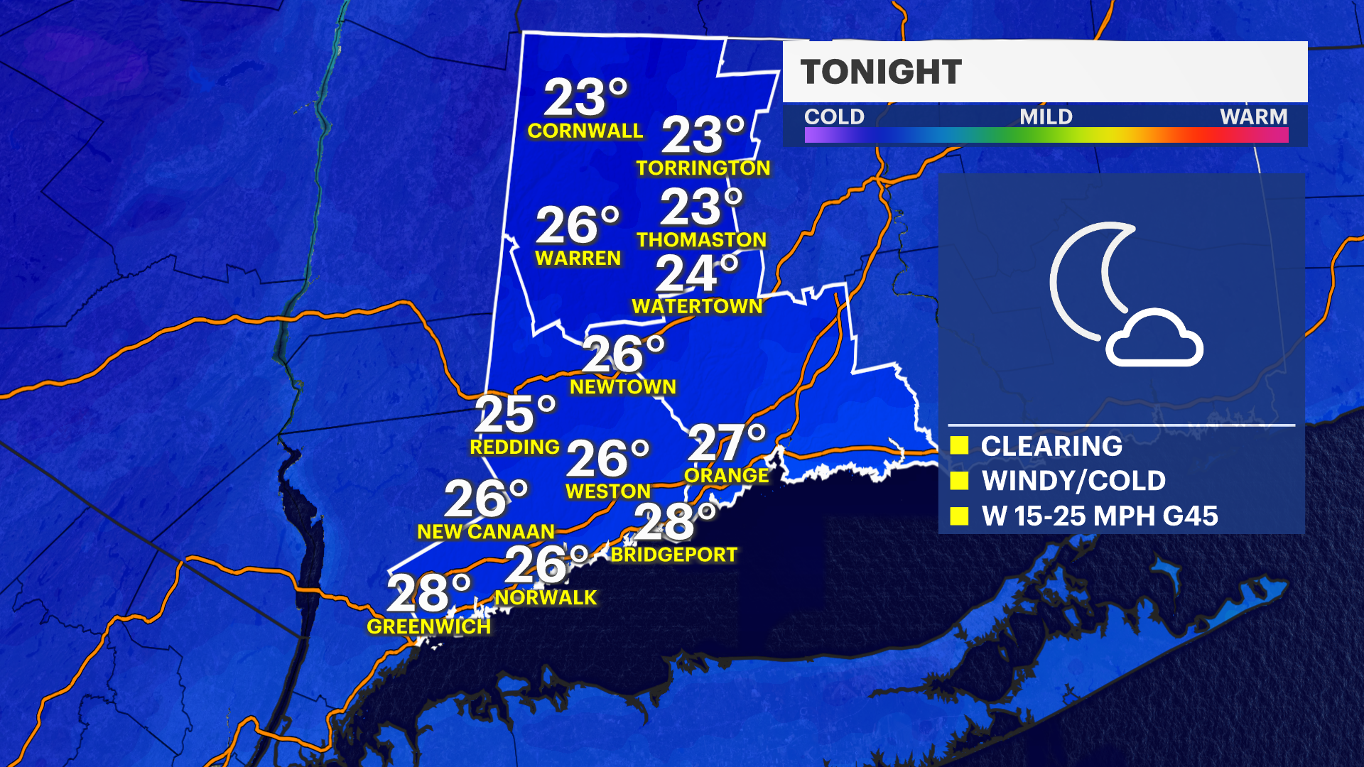 TONIGHT: Windy and cold. Low of 28.