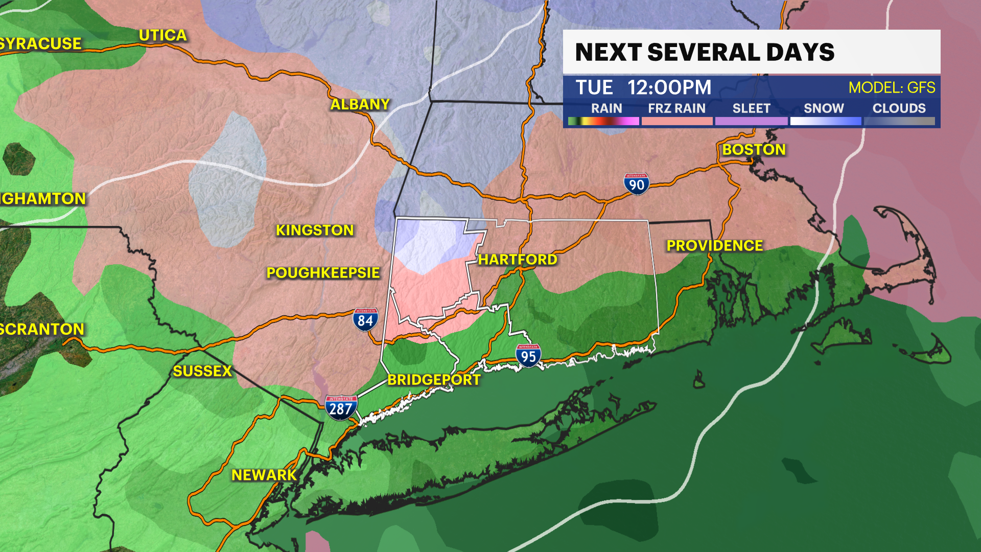 TUESDAY: Mostly cloudy. Snow to rain showers. High of 42.
