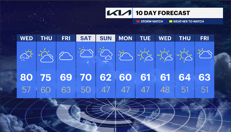 SUNDAY: Windy with a mostly cloudy sky. Fall temperatures come back, with a crisp feel in the air. Highs in the low 60s.
