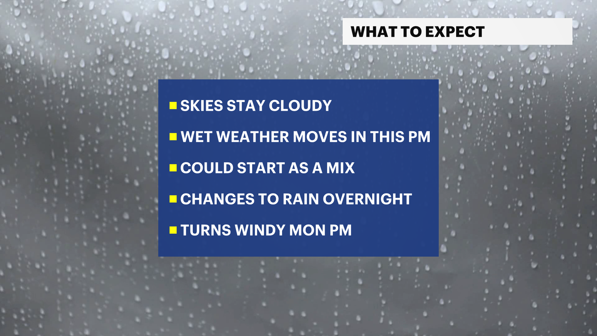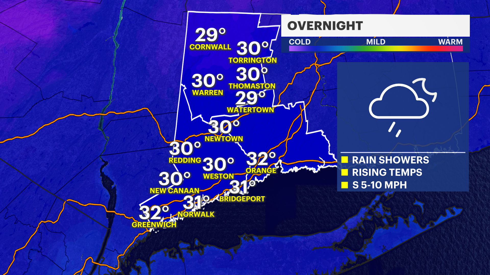 Tonight: Wintry mix early, including freezing rain or sleet, gradually changing to all rain as temperatures rise from the upper 30s to low 40s.