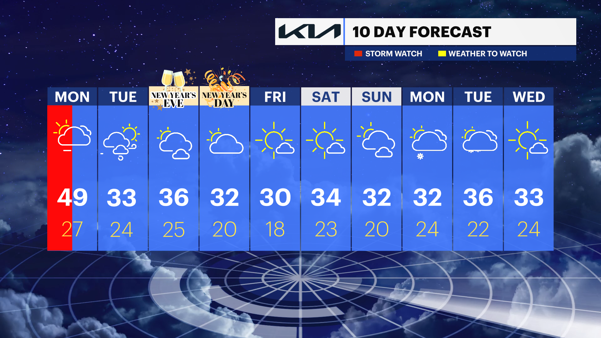 New Year’s Day: Dry with some sunshine. Temperatures range from the upper 20s to near 30.