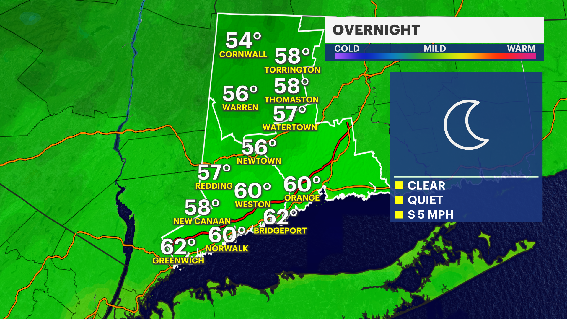 OVERNIGHT: Clear and comfortable. Patchy fog toward morning. Low of 60.