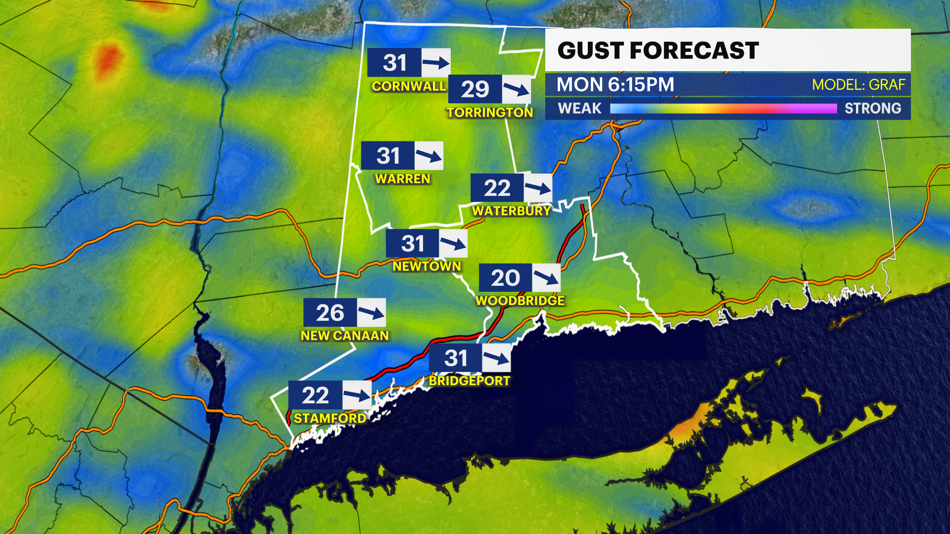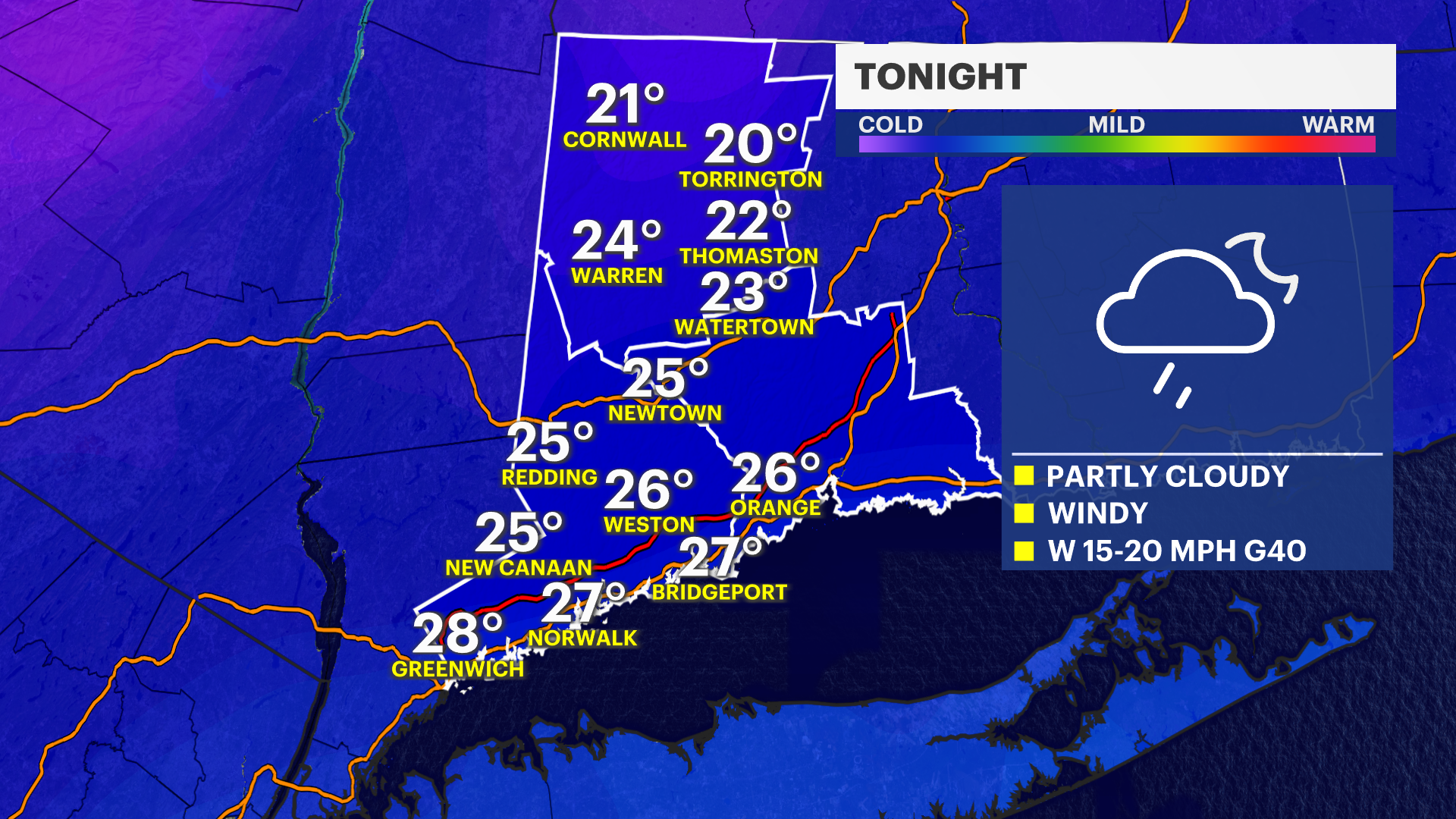 Tuesday: Partly sunny, breezy, and colder. Highs in the upper 20s to low 30s.