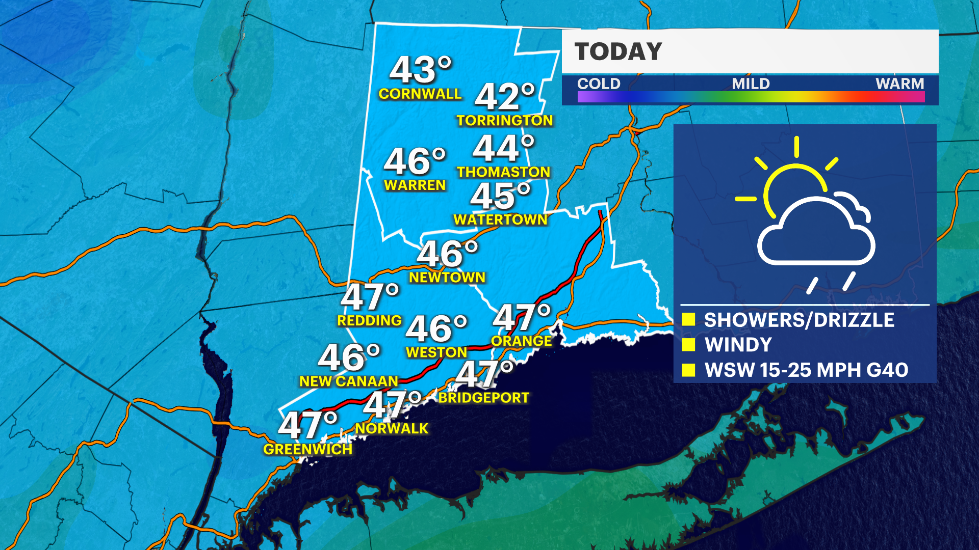 Today: Rain, mainly through the afternoon, with gusty winds. Temperatures range from the mid-40s to near 50.
