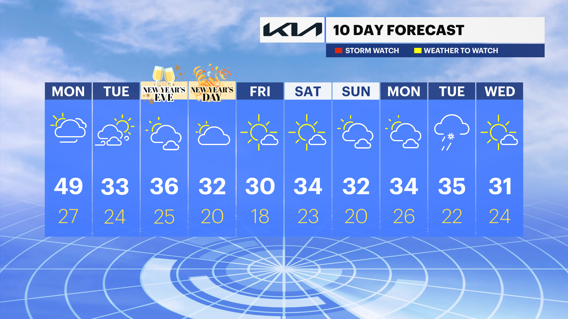 New Year’s Day: Dry with some sunshine. Temperatures range from the upper 20s to near 30.