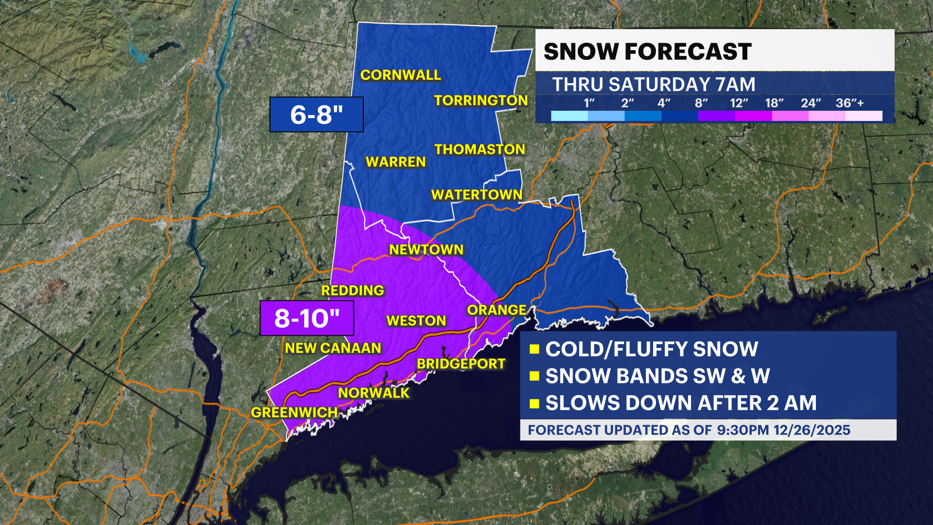 Snowfall totals will range from 6-10 inches from Fairfield County up through Litchfield County. Parts of Fairfield County could see 8-10 inches.