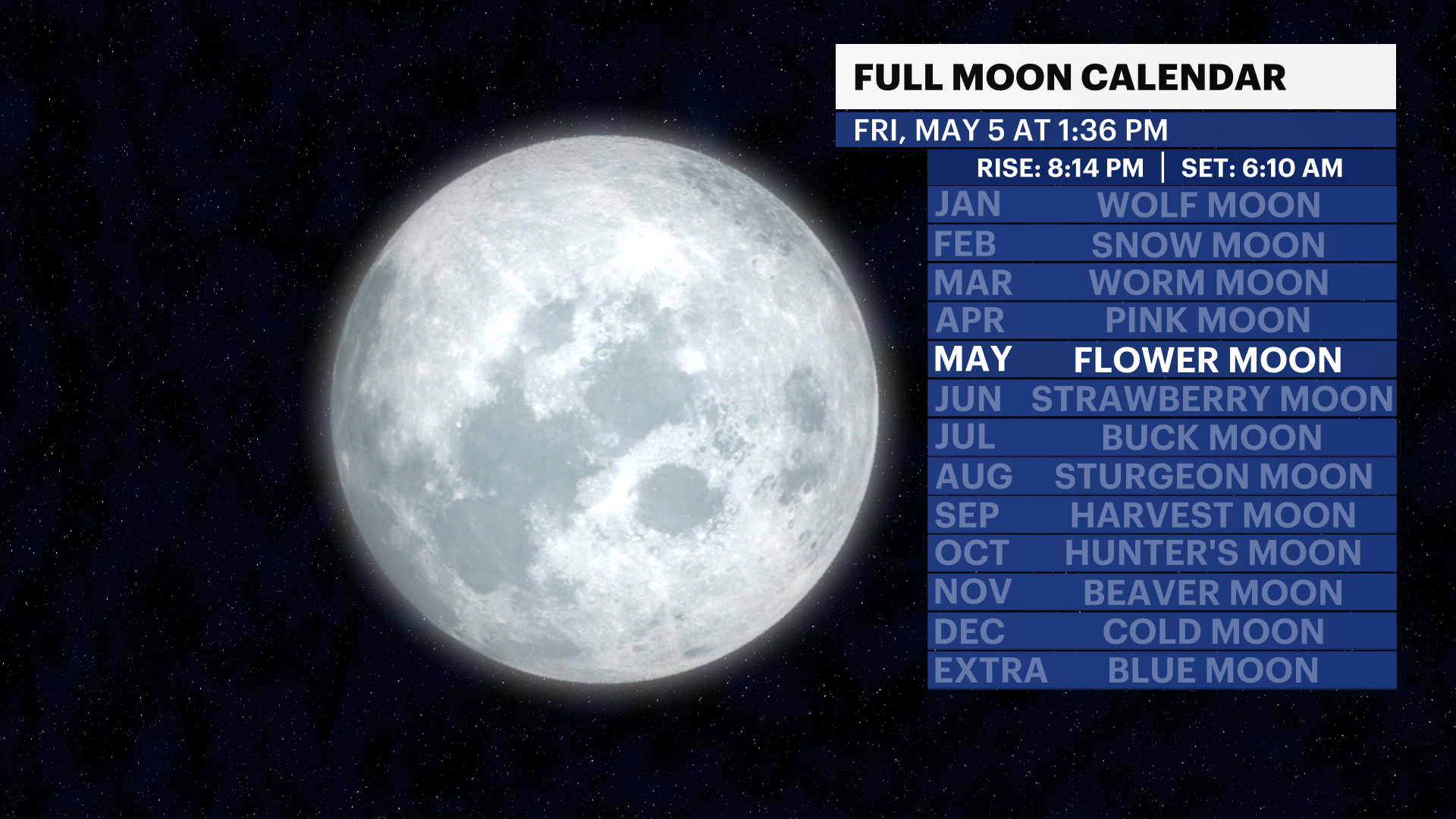 The full moon takes place on Friday, May 5. It is known as the Flower Moon due to the spring season and the abundance of flowers this time of year. The moon will be full at 1:36 p.m., but we won’t see it until at least 8:14 p.m. when it rises in the east. Be sure to look for it right after sunset and near the horizon. It will look larger before it rises higher in the sky.