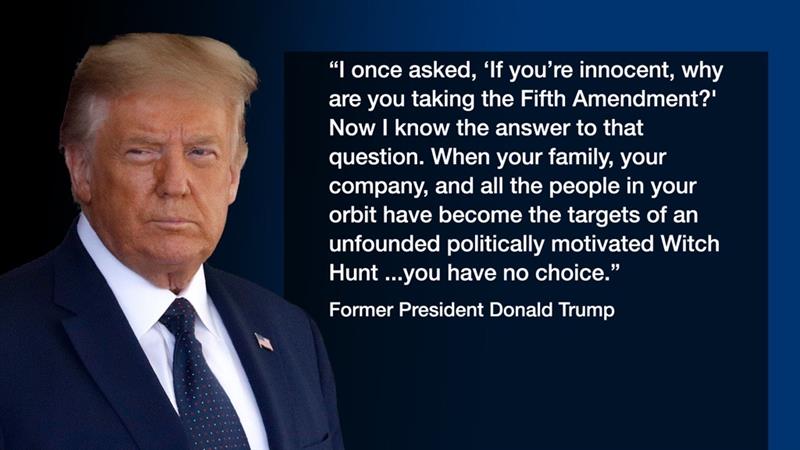 “I once asked, ‘If you’re innocent, why are you taking the Fifth Amendment?' Now I know the answer to that question,” the statement said. “When your family, your company, and all the people in your orbit have become the targets of an unfounded politically motivated Witch Hunt supported by lawyers, prosecutors and the Fake News Media, you have no choice.”