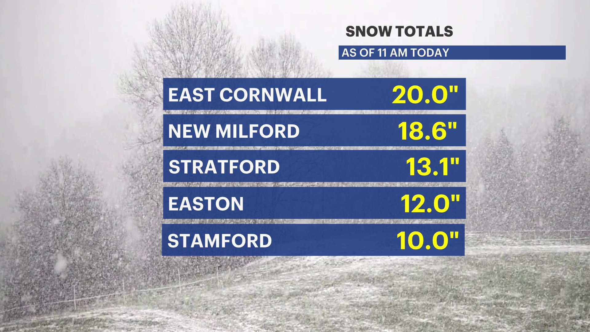 STORM AFTERMATH: Big snow totals across western CT as cold air dominates the forecast