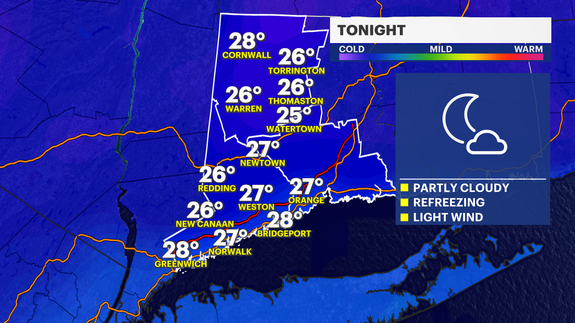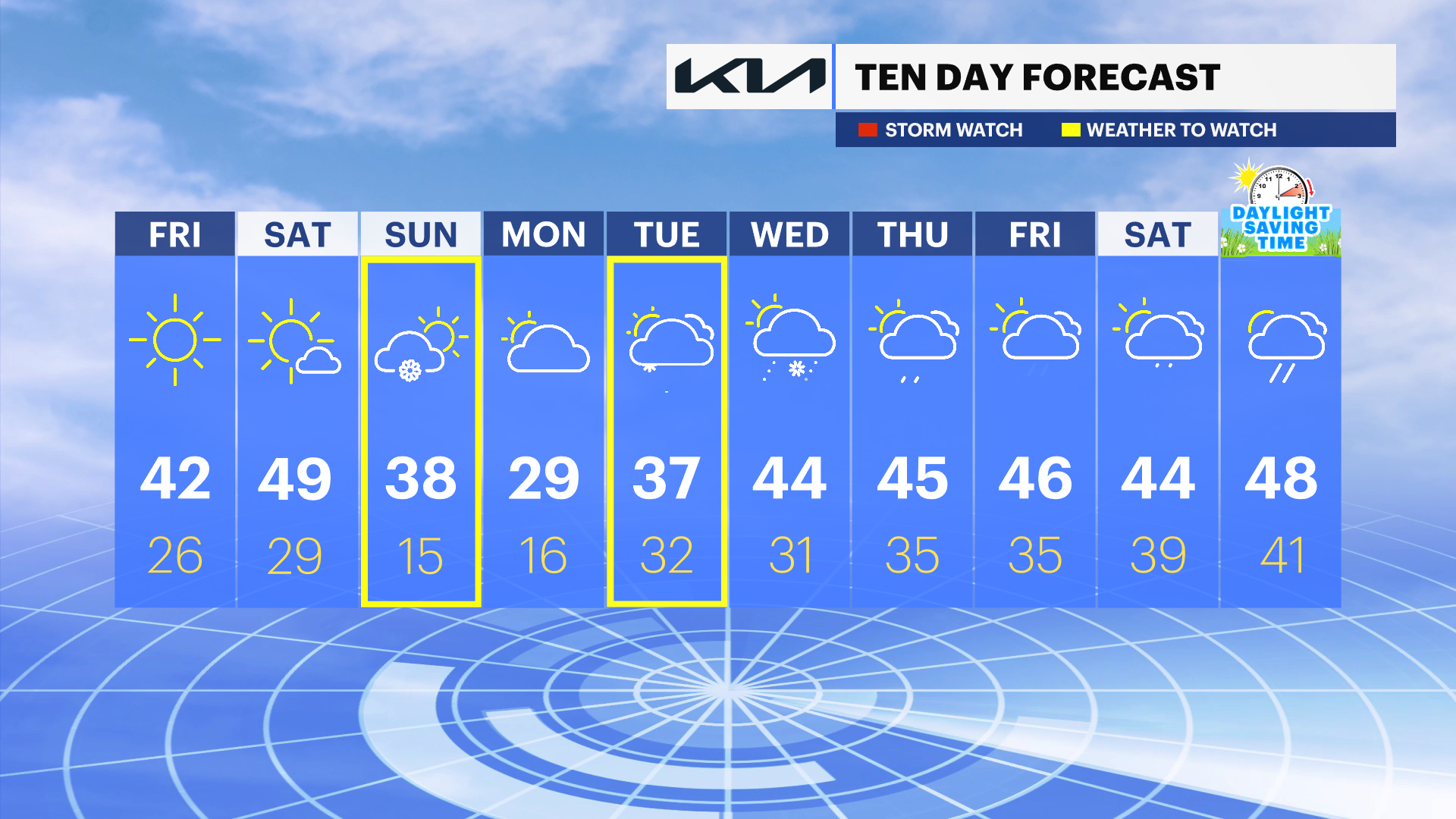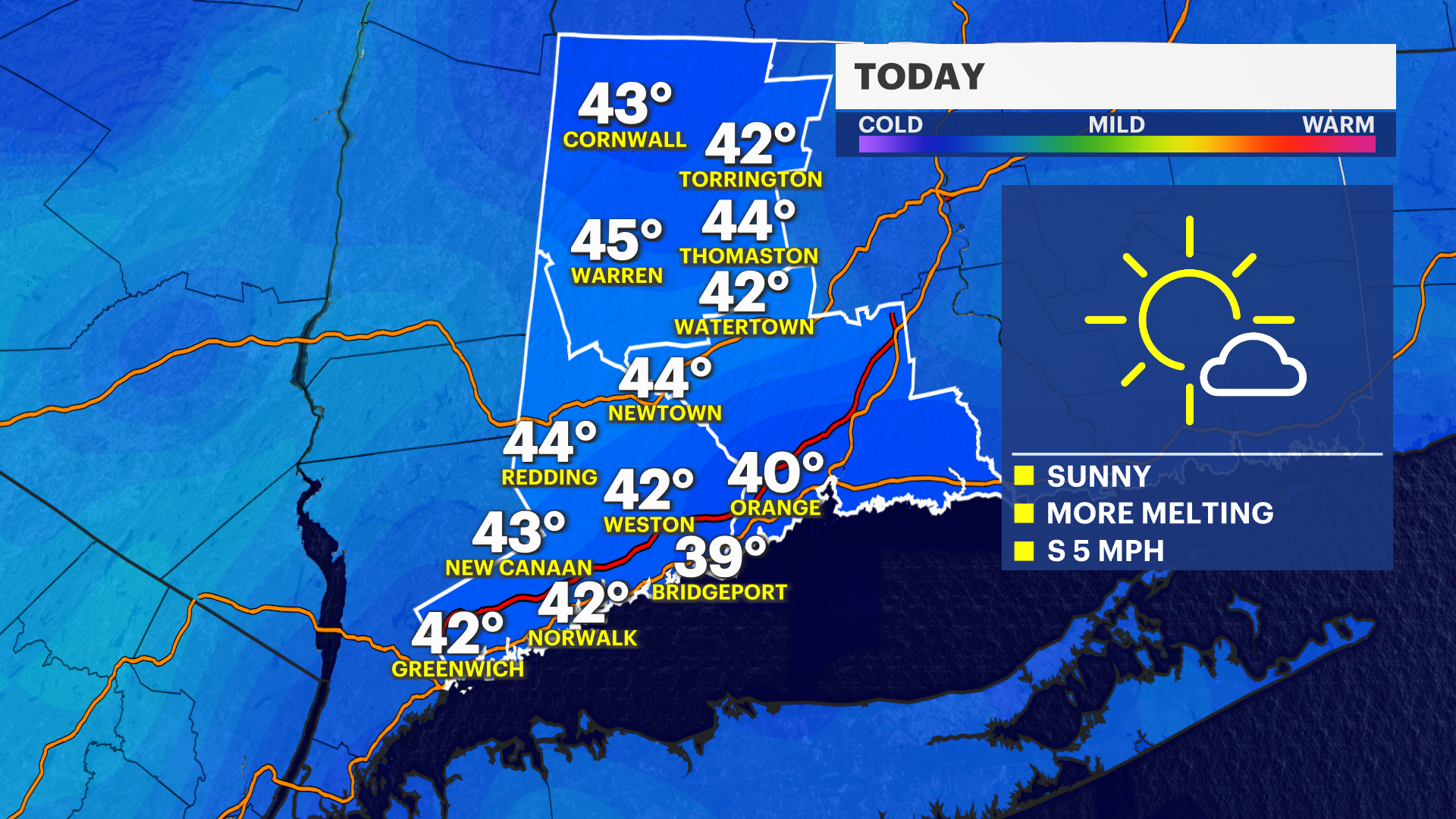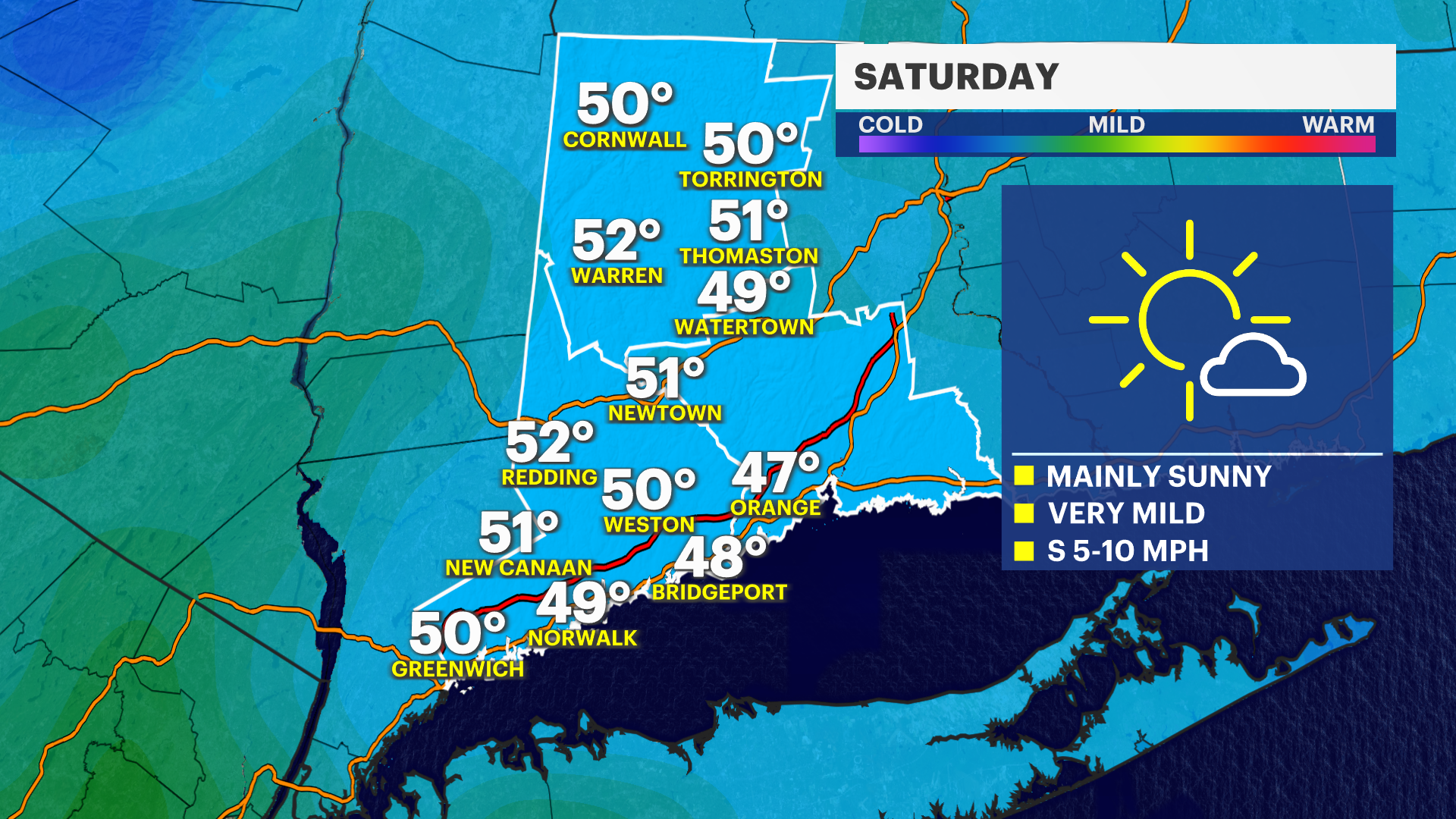 It's a mild Friday afternoon with high temperatures in the low 40s under abundant sunshine. Overnight tonight is cold. Temperatures are below freezing after 9 p.m. with lows in the mid-20s Saturday morning.