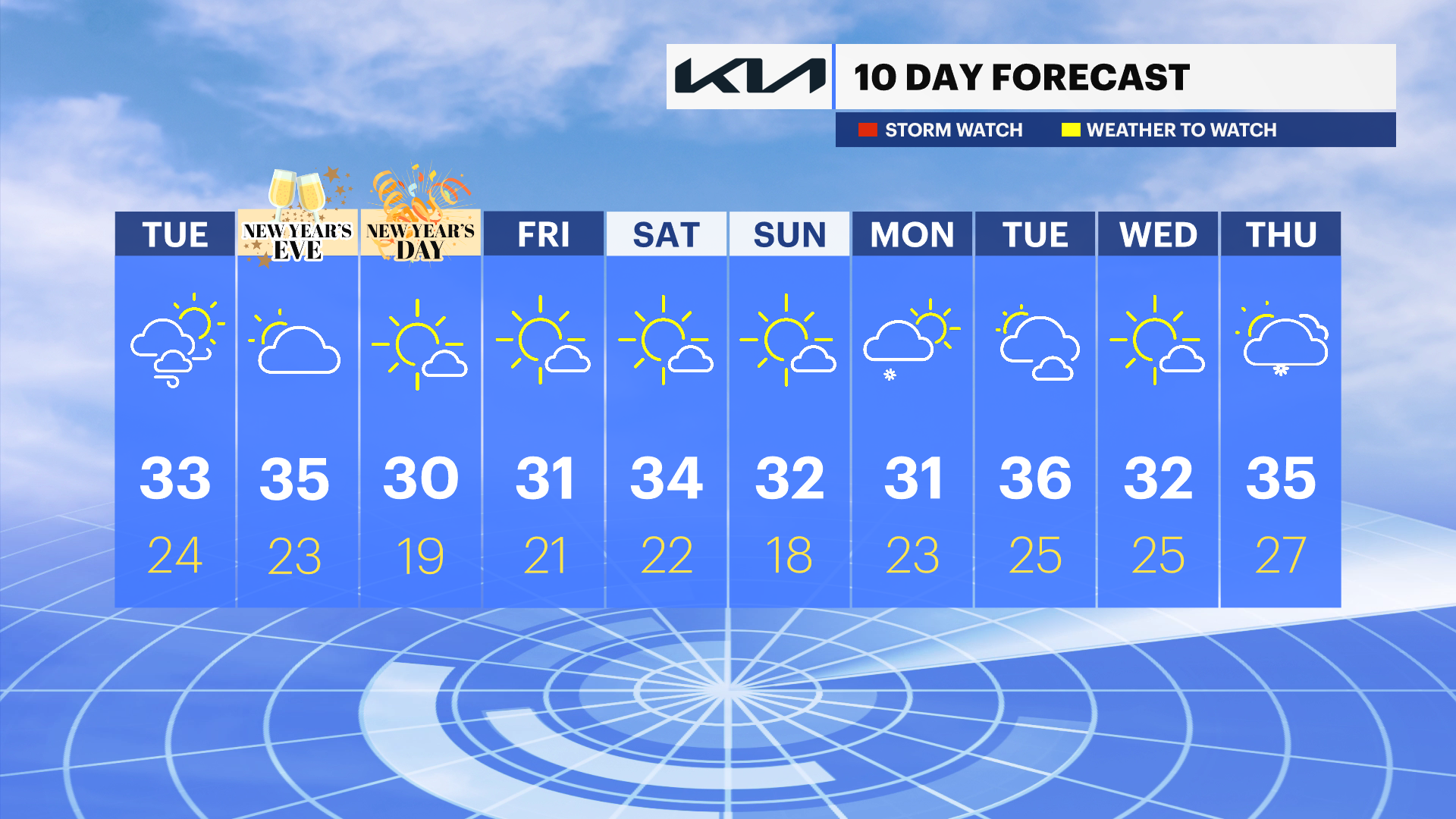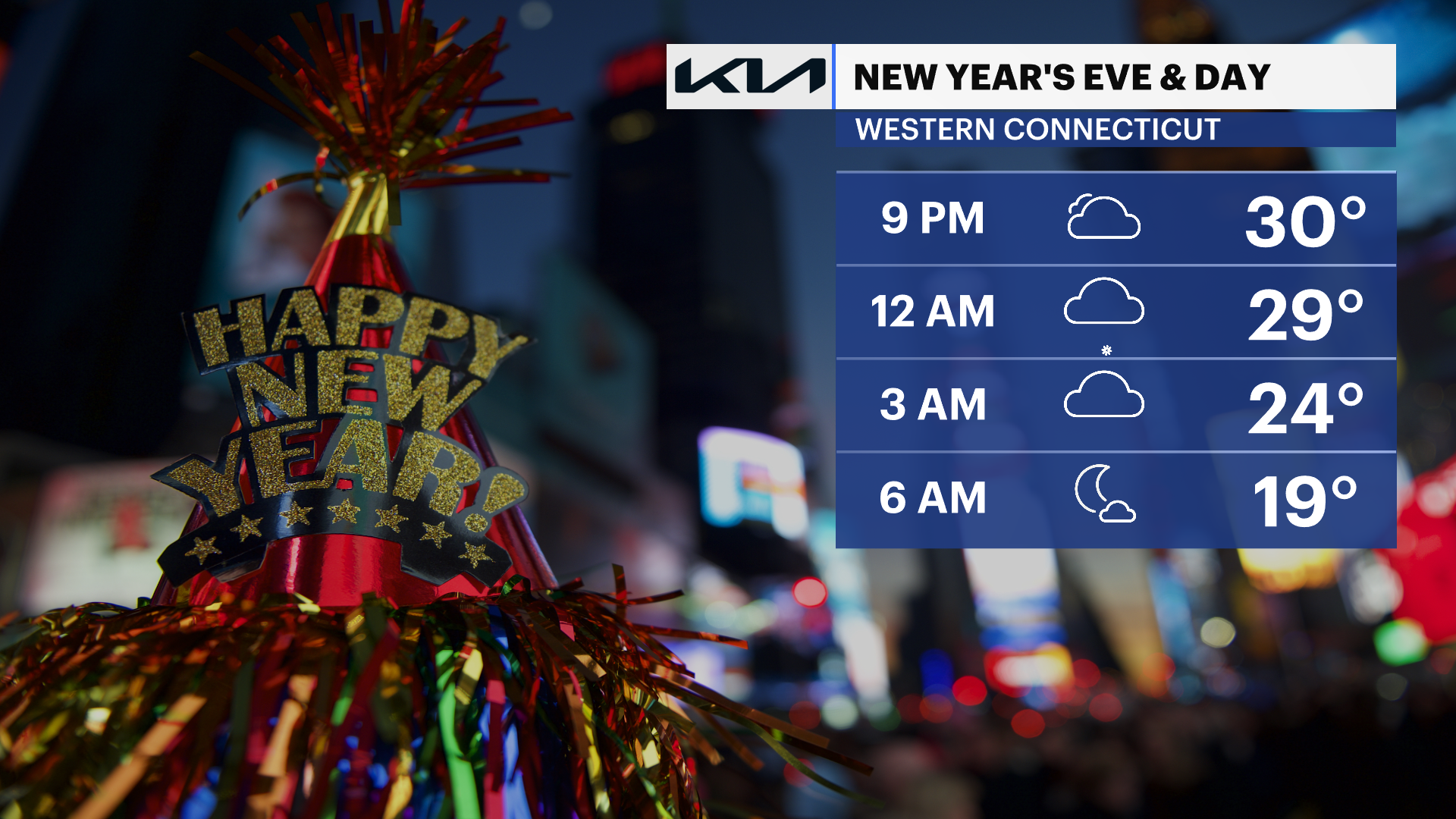 New Year’s Day: Mostly sunny and cold. Temperatures range from the upper 20s to around 30.