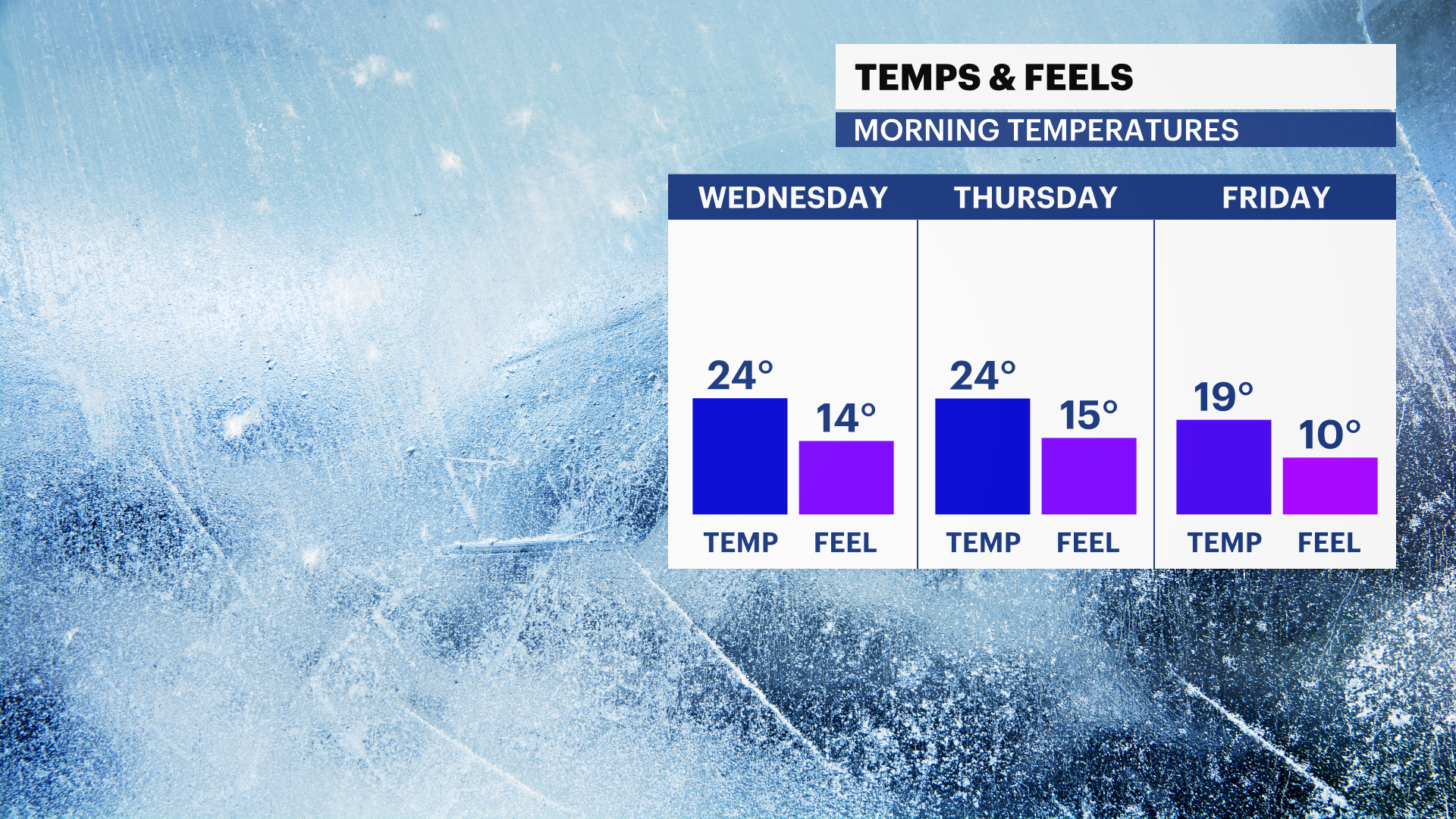 Wednesday: Mostly cloudy and chilly with highs in the low to mid-30s. Winds ease slightly compared to Tuesday.
