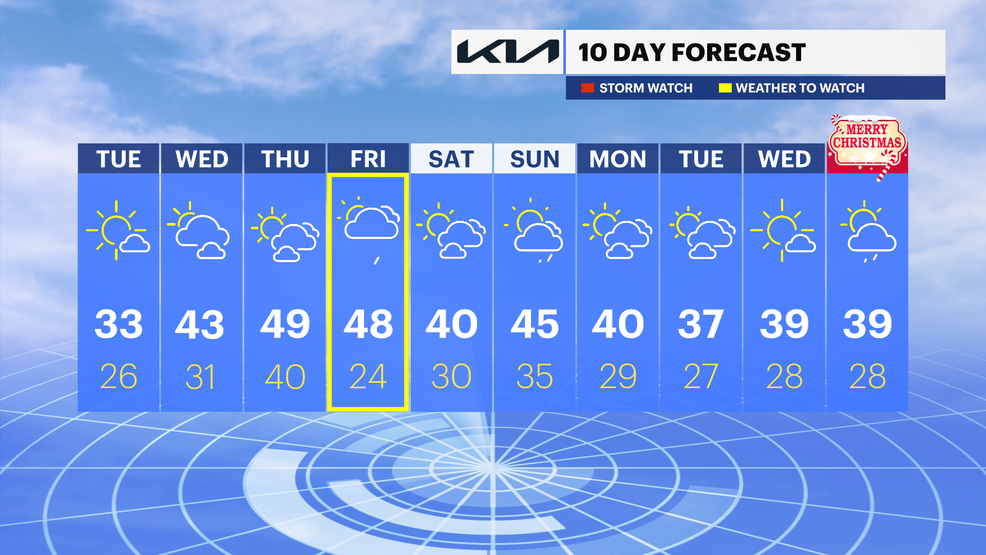A noticeable warm-up arrives midweek as southwest winds bring milder air, pushing temperatures into the 40s and near 50 by Thursday.