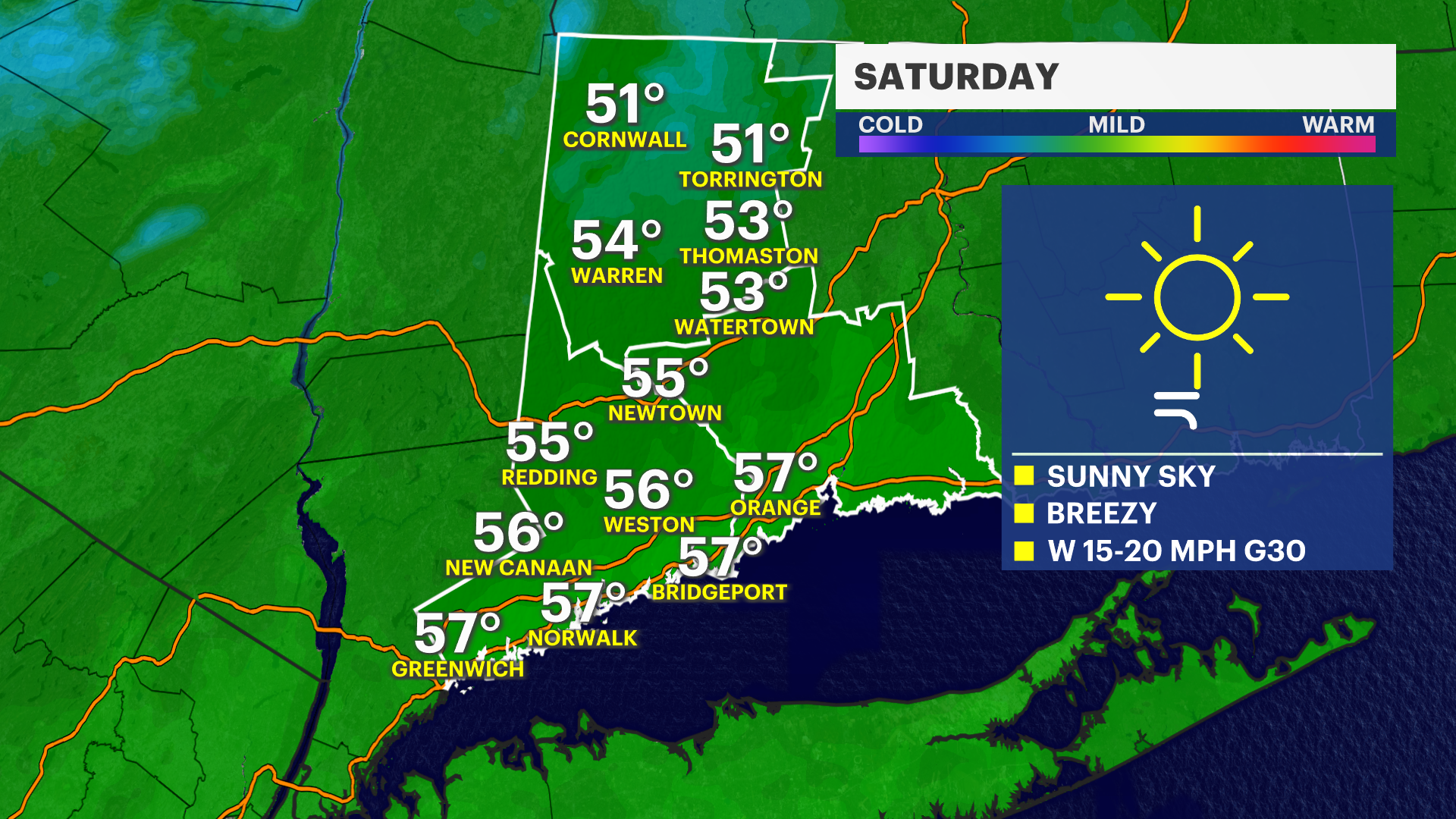 SATURDAY: Mostly sunny, breezy. High of 57.