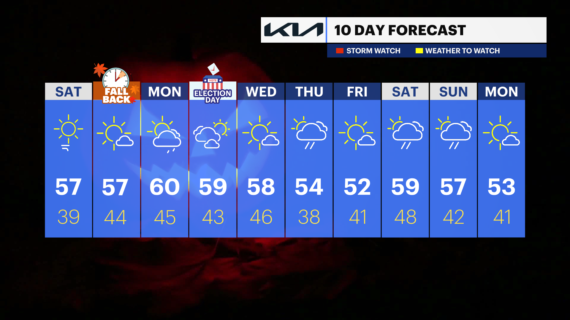 With lighter winds, temperatures will fall back into the 30s Saturday night into Sunday. This is also when we push the clocks back one hour and return to Standard Time.