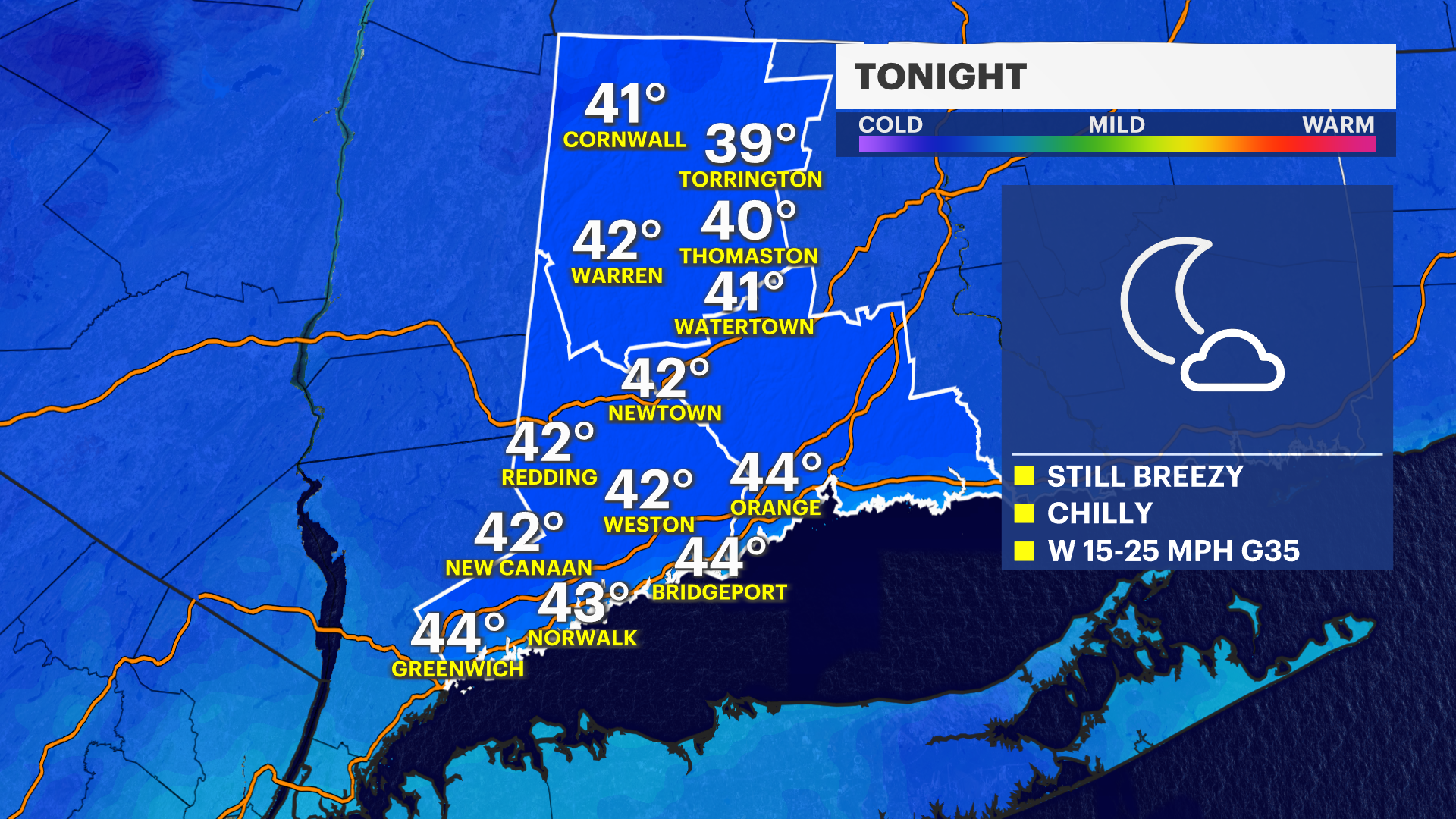 TONIGHT: Partly cloudy, breezy & cool. Low of 44.