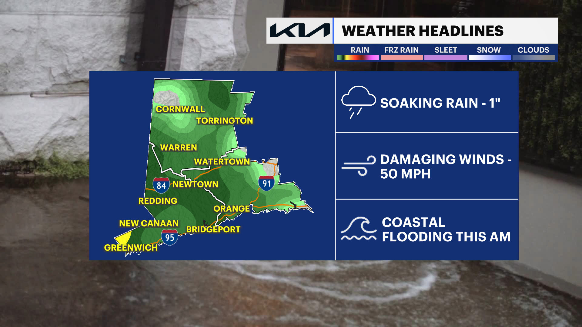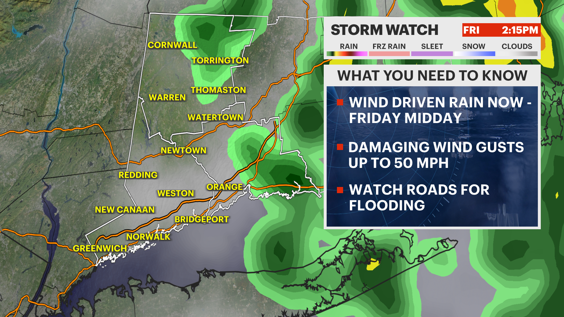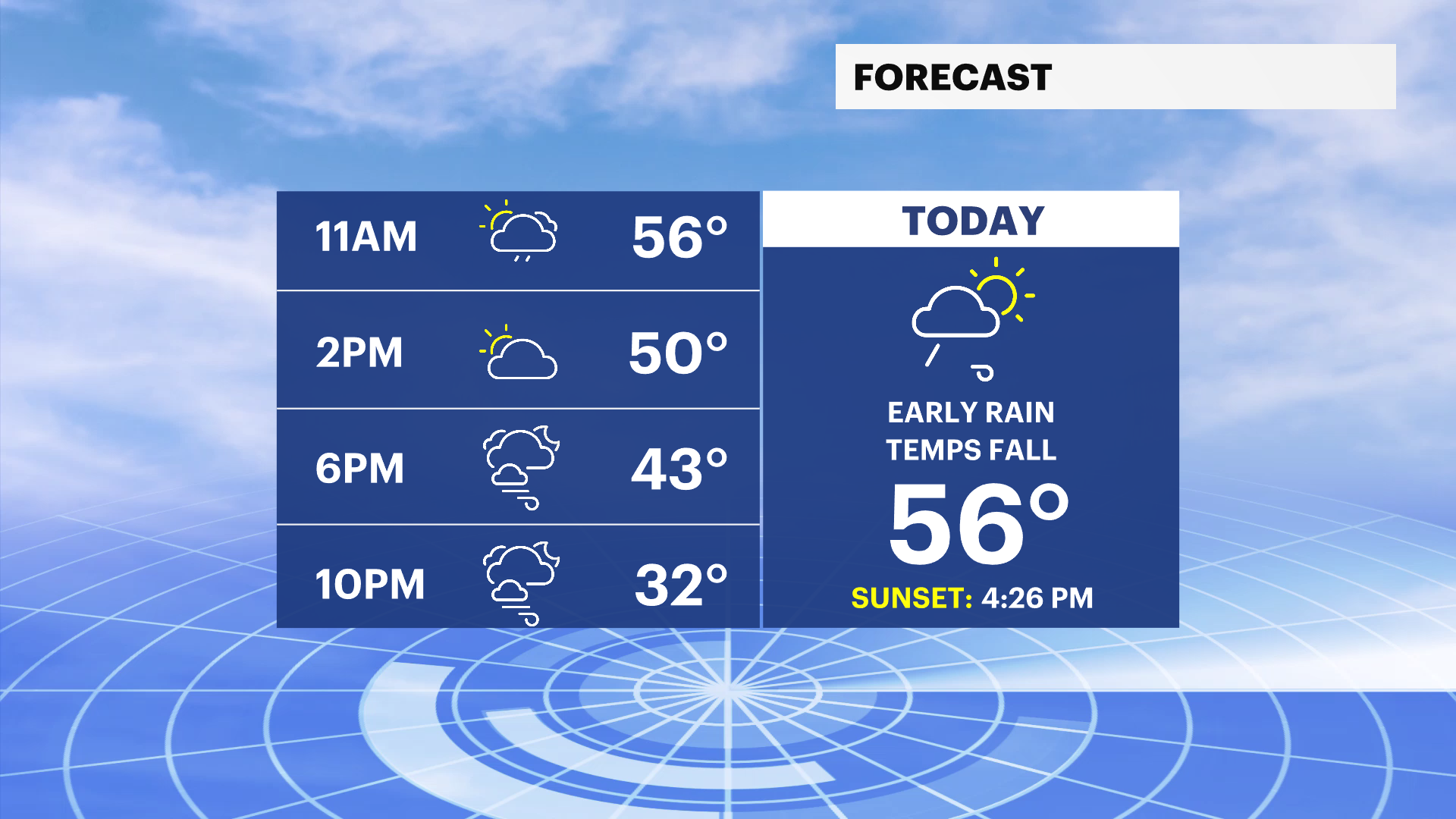 Today: Windy and wet with periods of heavy rain and a chance for a thunderstorm early. Temperatures rise into the low-to-mid 50s, then fall into the mid-to-upper 40s by afternoon.