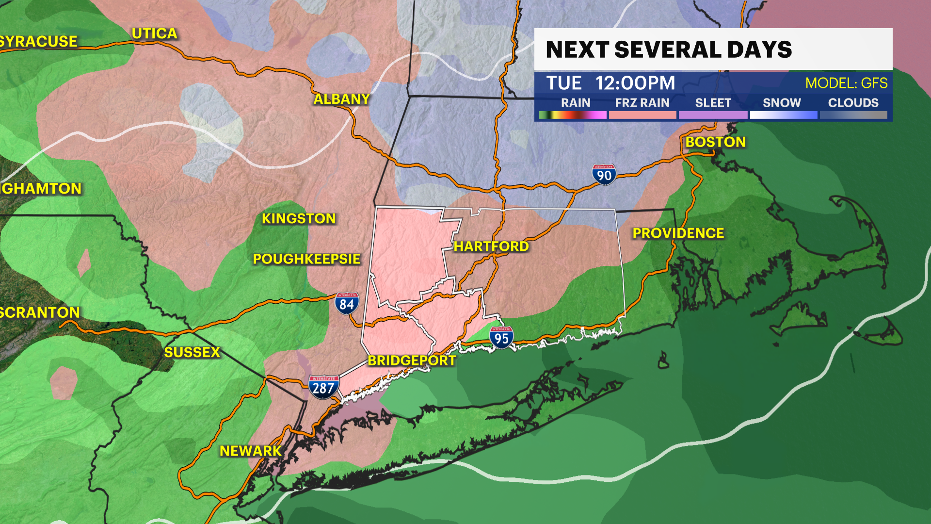 Tuesday: Mostly cloudy with snow possible early, mixing with rain at times. Highs in the upper 30s to near 40.