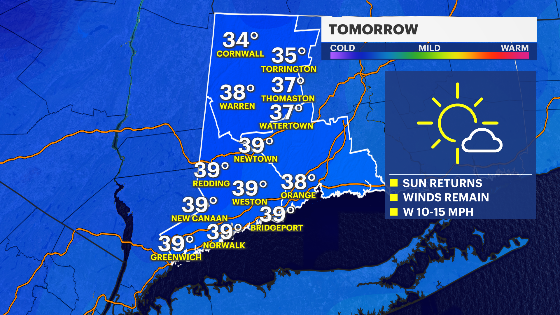 Wednesday: Mostly sunny and milder. Highs in the low-to-mid 40s.