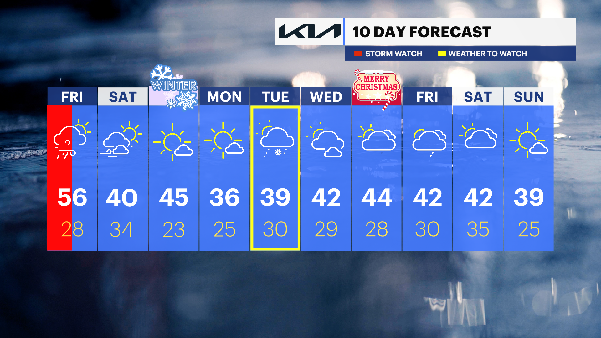 Christmas Day: Mostly cloudy with periods of rain possible. Highs in the mid 40s.