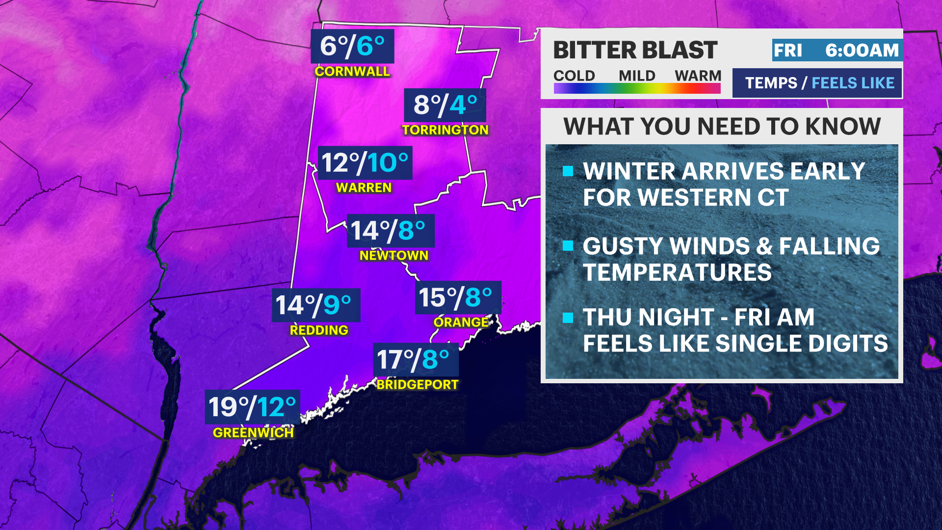 FRIDAY: Mostly sunny and cold. Chance of late snow showers. High of 32.