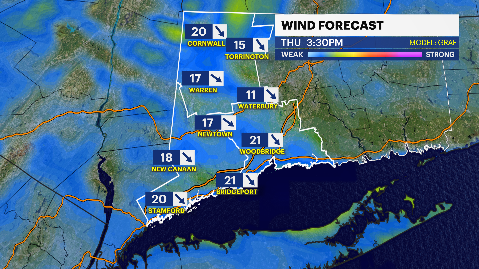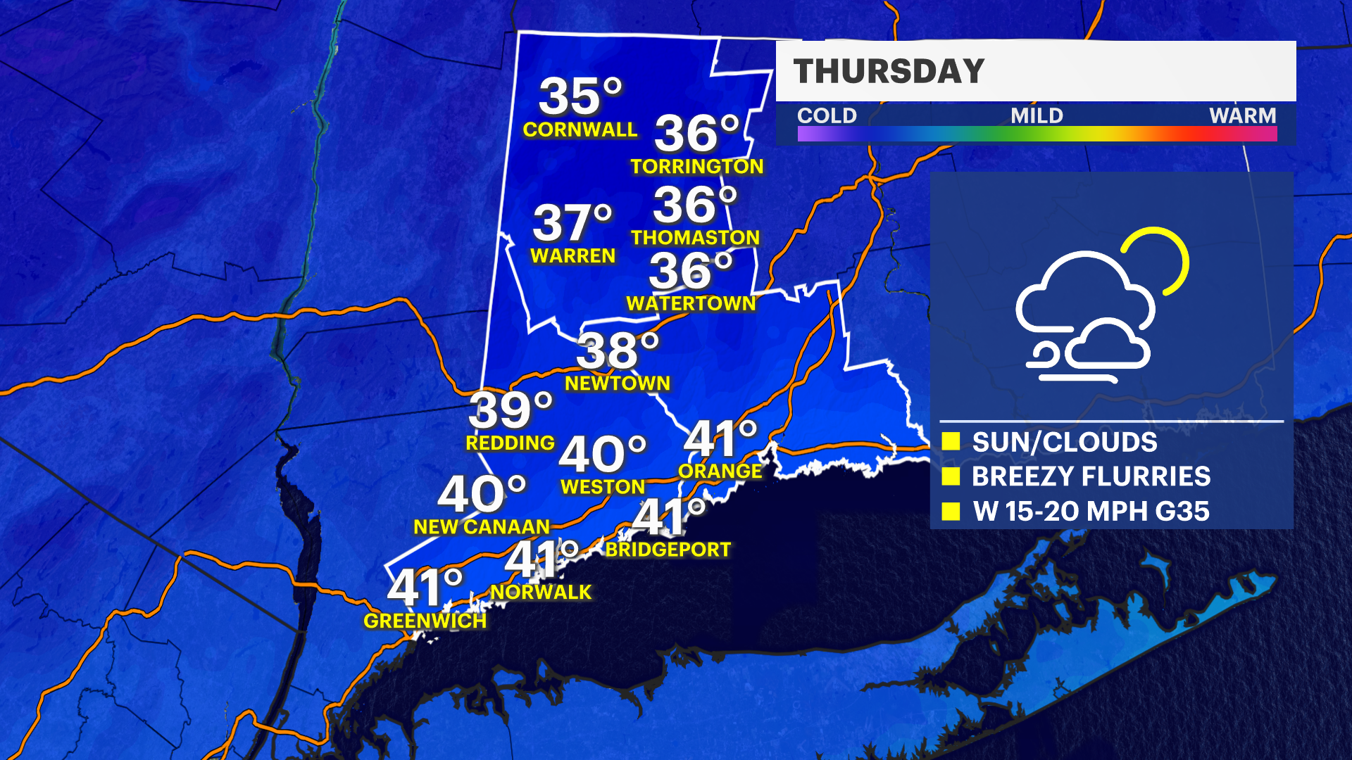 THURSDAY: Sun and clouds. Breezy with snow showers. High of 41.