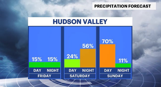 SATURDAY: Mostly sunny to mostly cloudy with a late day shower chance. Highs: upper 60s to low 70s. Lows: mid-40s.