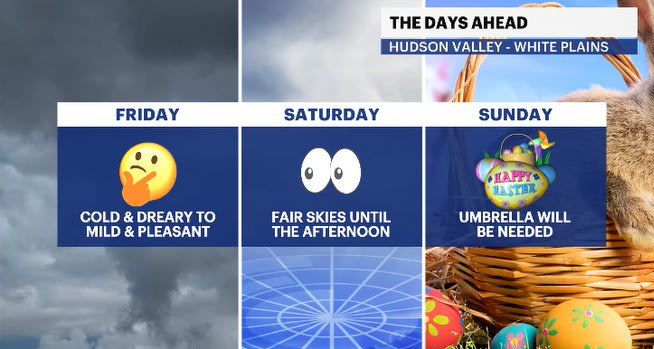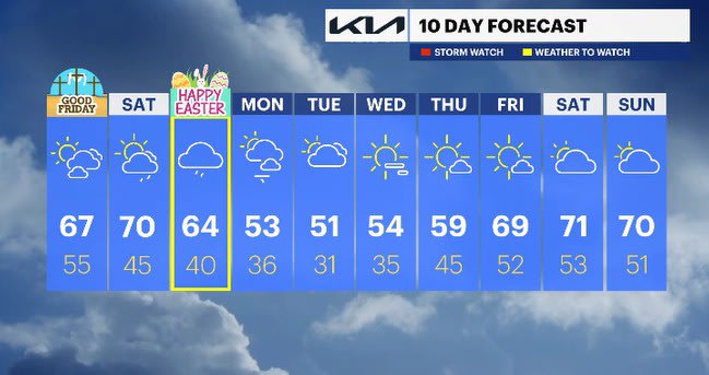 SUNDAY: WEATHER TO WATCH - EASTER - Mostly cloudy to overcast with scattered showers possible for the late morning hours into the afternoon. Highs: mid-60s. Lows: upper 30s to low 40s.